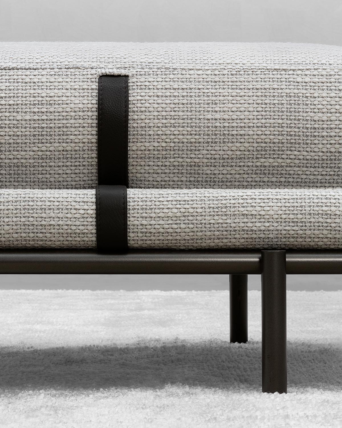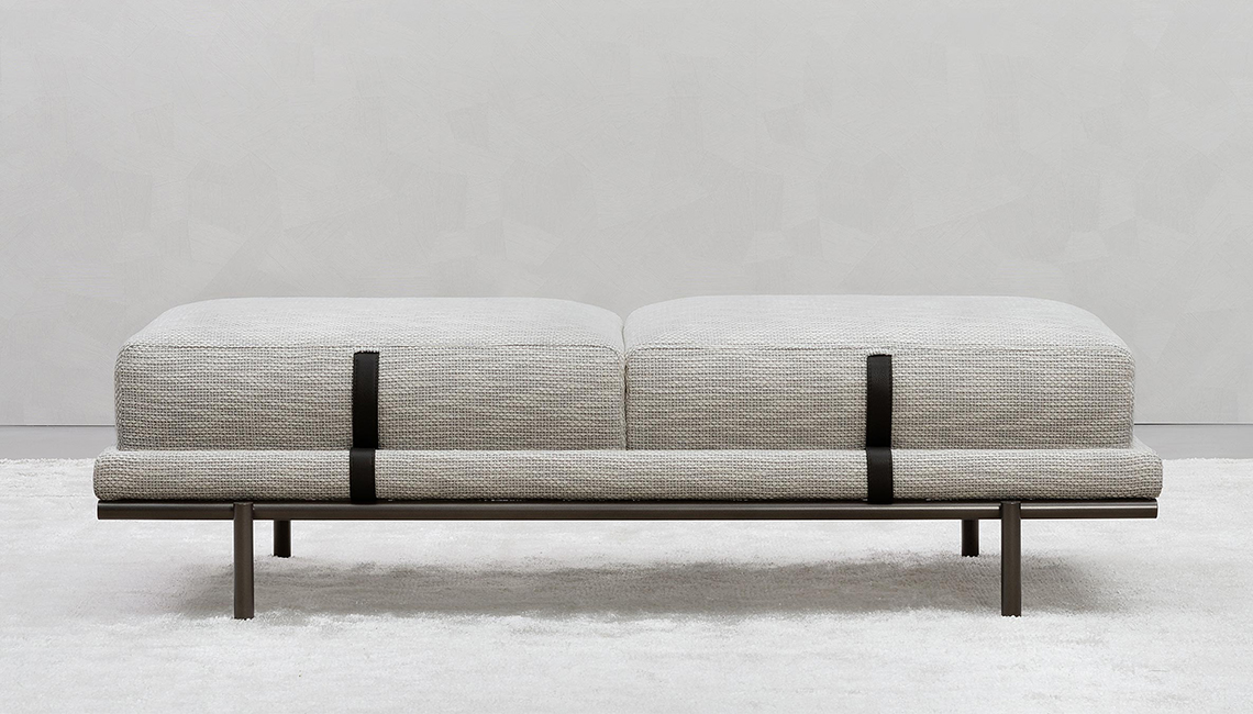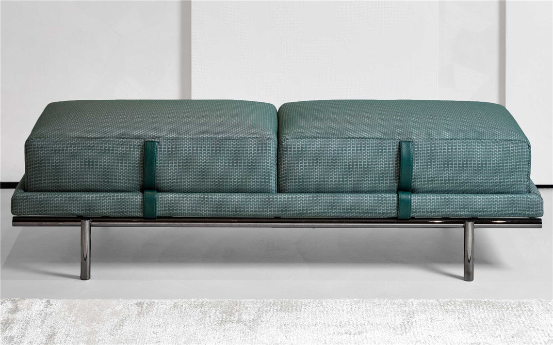 New Bond長凳是同名床的理想補(bǔ)充物,讓人想起它無可置疑的裁縫品質(zhì)。襯墊結(jié)構(gòu)由細(xì)長的圓柱形金屬支撐,上面加蓋精細(xì)縫合的電子。縫紉和靠墊工藝煥發(fā)了床的本性和特點(diǎn),通過ton-sur-ton或?qū)Ρ壬じ锏奶厥膺吔橇线B接:這是一個強(qiáng)調(diào)精致的設(shè)計細(xì)節(jié)。完全可拆卸的織物或皮革罩。每個版本的皮面都是真皮材質(zhì),金屬色表腳采用拋光亞光或光面黑色鎳質(zhì)飾面。