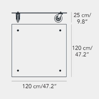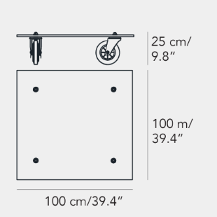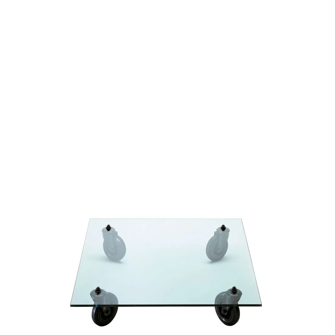 Un carrello industriale utilizzato nella sede di FontanaArte per il trasporto di vetri: è questo l’oggetto che ha ispirato Gae Aulenti nella progettazione di Tavolo con Ruote, esempio di una progettualità intuitiva nata dall’associazione con strumenti di uso quotidiano e tradotta in prototipo senza passare per il disegno. Nel progetto di Tavolo con Ruote il piano di legno del carrello industriale viene sostituito con una spessa lastra in vetro molato -simbolo della storia produttiva dell’azienda – a cui vengono fissate le rotelle industriali a movimento libero. E’ così che la sostituzione di un semplice elemento trasforma la natura dell’oggetto e la sua destinazione d’uso.