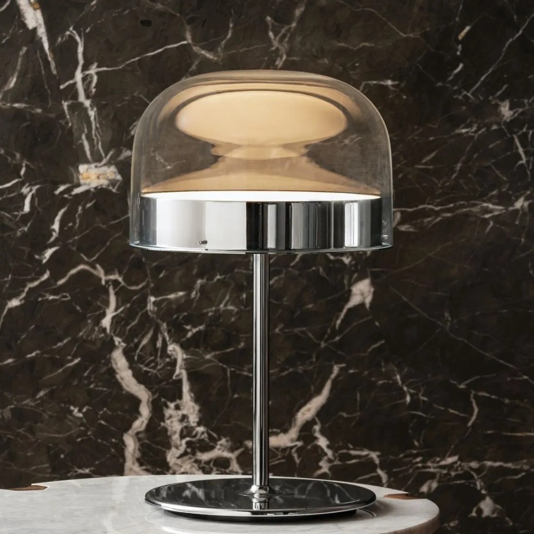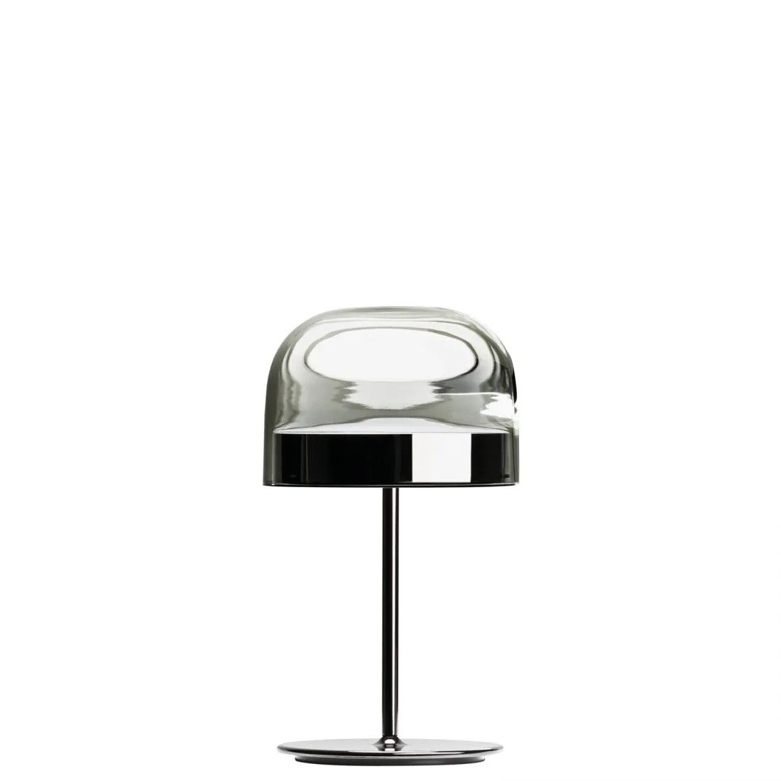 Equatore: reinterpretazione in chiave contemporanea delle classiche lampade con paralume in vetro. Se nelle tradizionali abat-jour il diffusore alloggia al suo interno la sorgente luminosa, in questa famiglia di lampade il diffusore è paradossalmente e suggestivamente vuoto e l’effetto luminoso è prodotto da due dischi luminosi all’interno di una fascia metallica centrale, visibile sul paralume e che richiama la linea dell’equatore. La luce prodotta dai Led, grazie a schermi interni disposti a strati, si distribuisce regolarmente sulla superficie dei dischi, irradiandoli magicamente di luce. Il disco inferiore produce un’emissione luminosa verso il basso, quello superiore illumina la calotta di vetro, per una diffusione morbida della luce. Disponibile da tavolo, da terra e da sospensione, in due misure, si declina in due tonalità: una più fredda, in grigio con struttura cromo scuro, e una più calda, con calotta trasparente tortora e struttura color rame.
