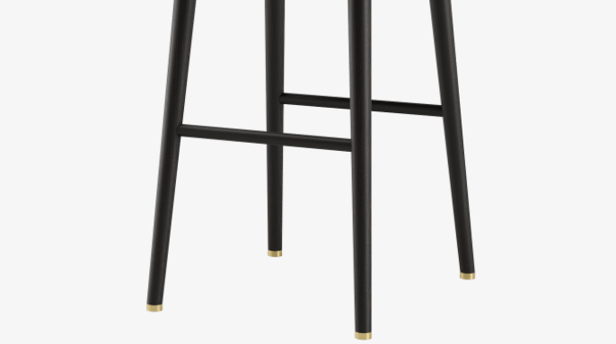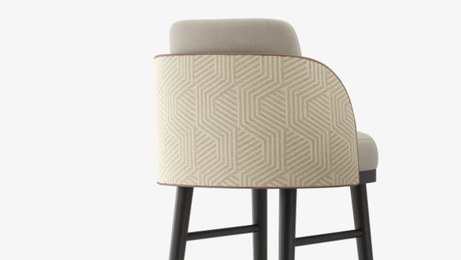 The elevated design of the PALMA bar stool plays with different upholstery, contrasting a plush velvet seat with a distinctive graphic fabric across the back.