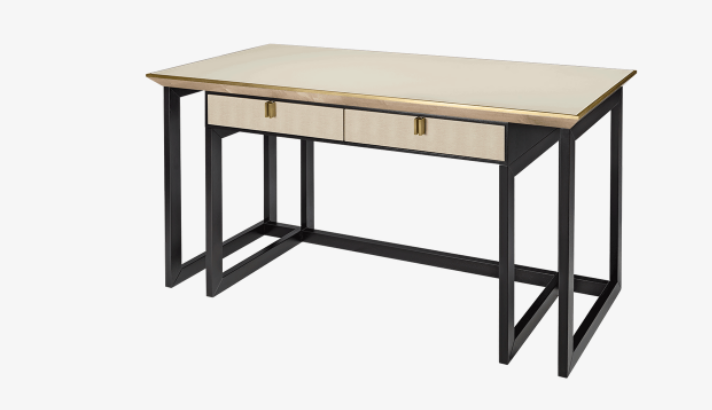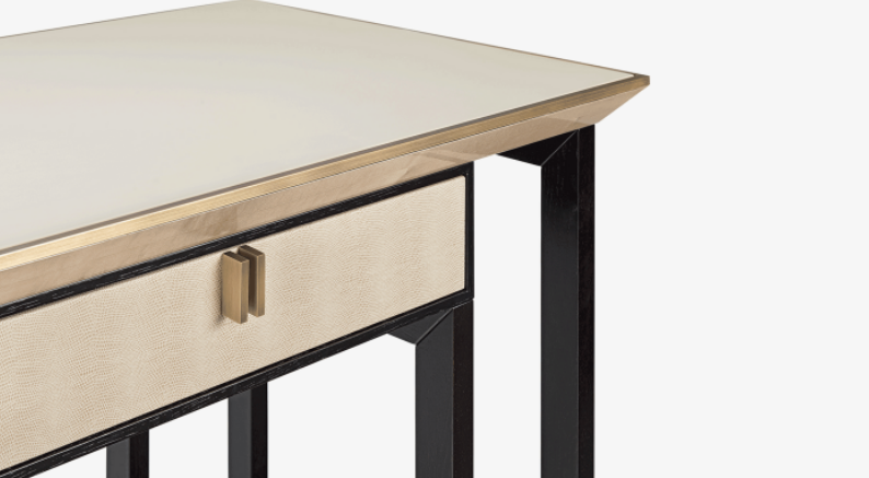 A design worthy of future heirloom status, the BALI desk is a sophisticated home office solution. Notice how the sculptural dark wood base showcases twin suede-lined drawers and a surface finished in textured leather and brushed brass.