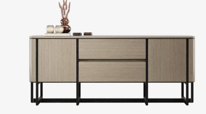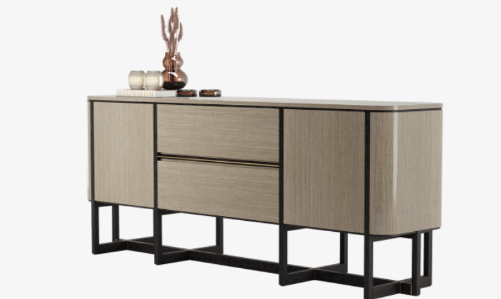 A refined combination of veneer, solid wood and brushed brass, the two-drawer/two-door MUMBAI sideboard's curved silhouette feels warm and welcoming, while a striking architectural base provides a confident finish.
