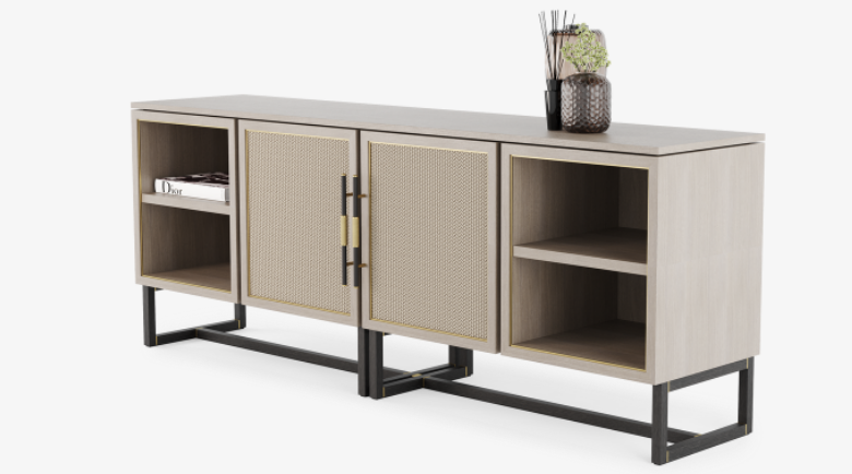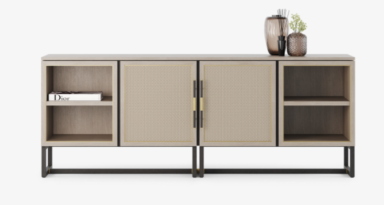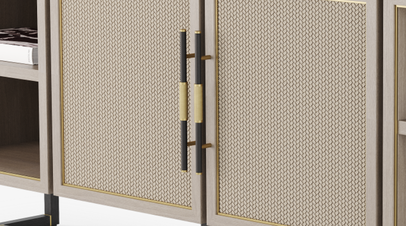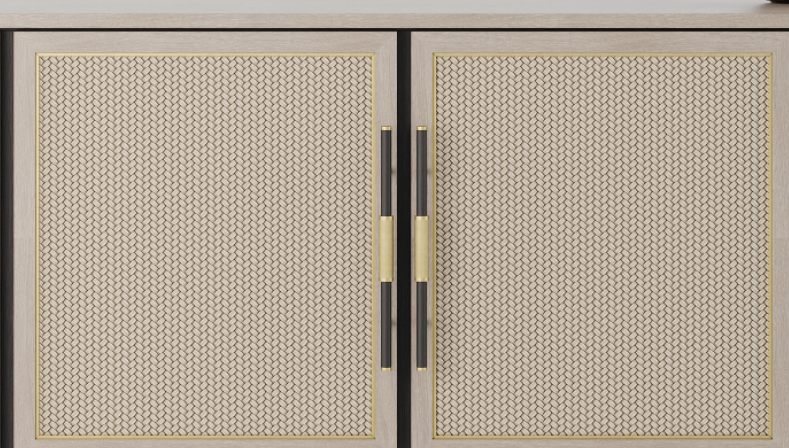 The MYKONOS sideboard is full of design details that are both pleasing to look at and to touch. These include etched brass ‘cuffs’ on the elegant handles and intricately woven faux-leather across each door front.