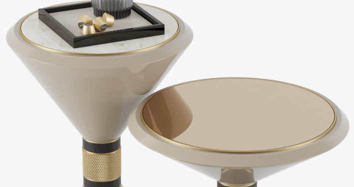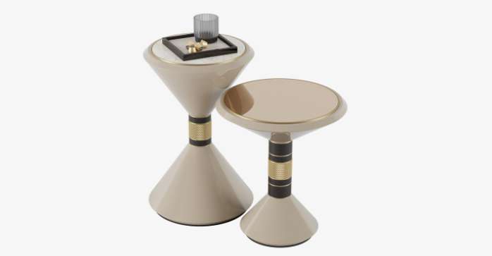 With their conical forms and geometric aesthetic, the design of the HAVANA side tables is a restrained nod to the Memphis movement. Their playful appeal is underpinned by strong materiality, blending marble, lacquered wood veneer and brushed brass accents.