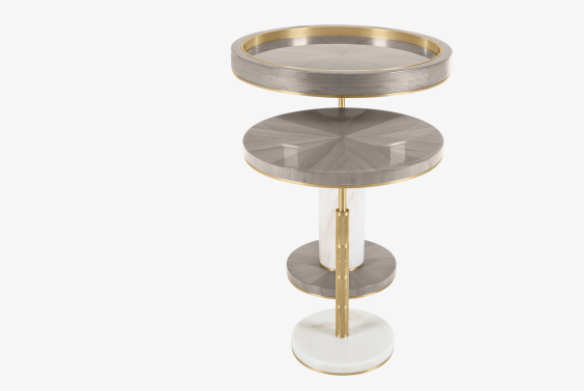 The SEATTLE features a pair of elegant side tables that stand at different heights, allowing them to neatly and chicly slot together. Presenting two different but equally sculptural silhouettes, they’re crafted from glossy veneer, brushed brass and stone.