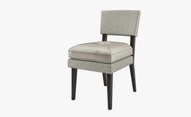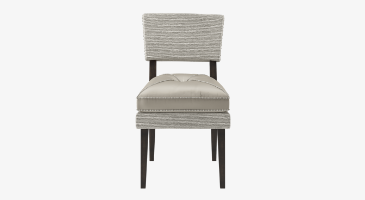 Our stylish BASEL dining chair features a classic silhouette that's elevated through distinctive upholstery, which blends a plain velvet and striped fabric. Further design flourishes include a solid dark wood structure and metal studs, which outline the backrest.
