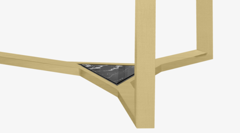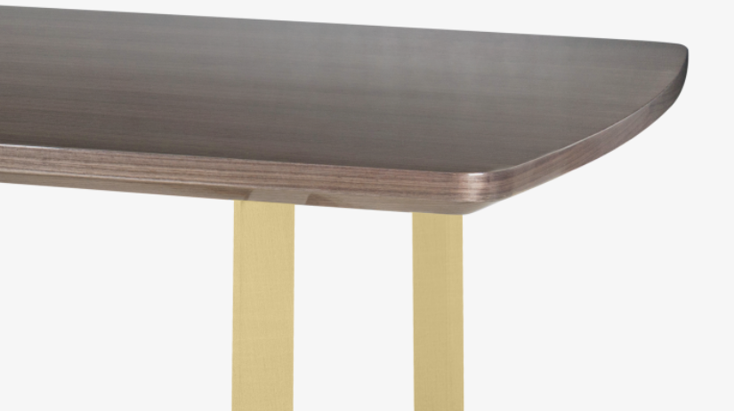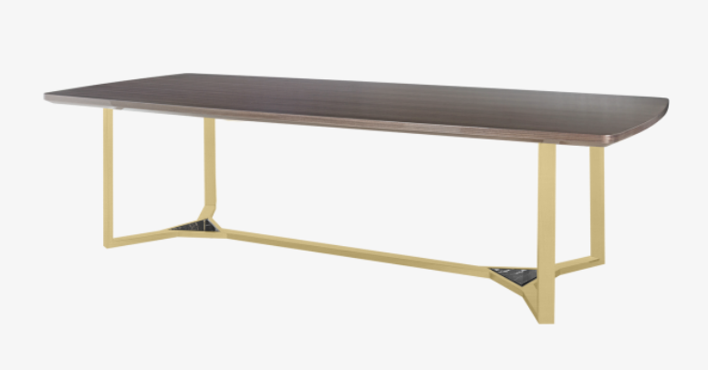 Pairing a streamlined, wood veneer top with a stunning brushed-brass frame, the ARENDAL Dining Table adds a final flourish at the base, where the curious will discover two inlaid triangles of stone edged in veneer.