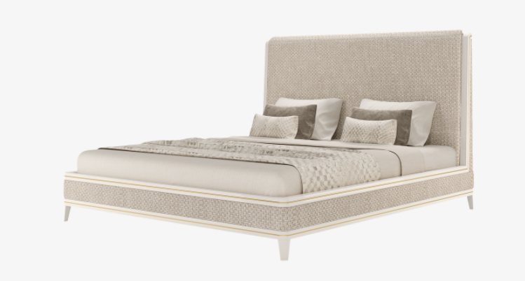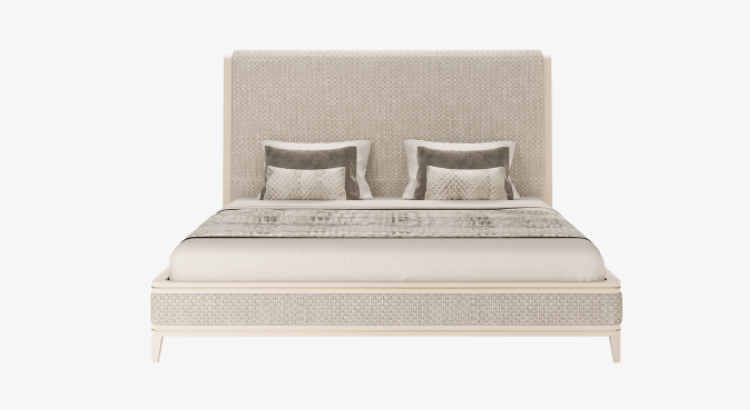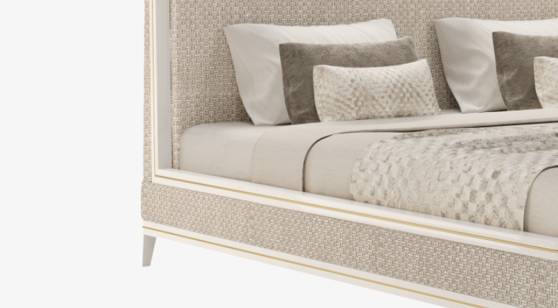 An intricate design, the CLICQUOT Bed adds a note of glamour to sleep spaces. Characterised by an oversized headboard and streamlined base, both are meticulously upholstered in thickly woven fabric and edged in creamy lacquer seamed with brushed brass.