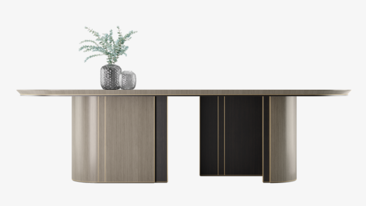 The cutting-edge TRENTO Dining Table’s wood veneer surface has been skilfully crafted to form a striking X-shaped pattern while the intriguing J-shaped legs are fashioned from overlapping layers of wood veneer in contrasting tones of light and dark.