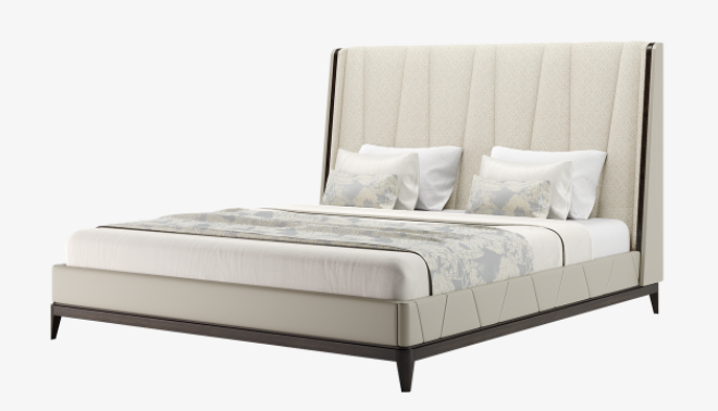 An oversized, upholstered headboard, tailored to form a tasteful V-style pattern, gives the elegant NANTES bed its statement look. This is encased in a creamy leather-covered exterior that sits over a simple, four-legged base in contrasting dark wood veneer.