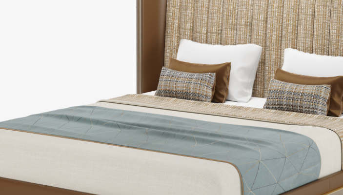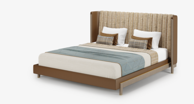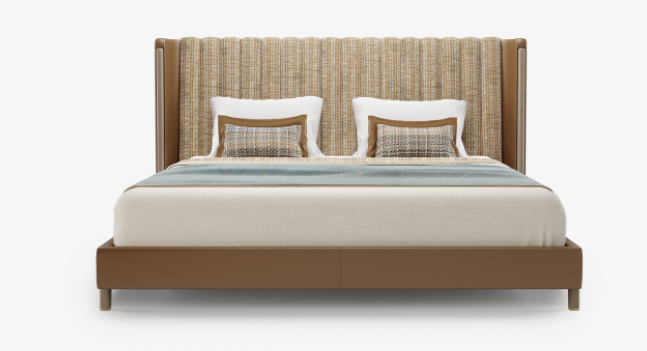 Bring some hotel-style luxury into your bedroom with the sophisticated SPLIT bed, which attracts the eye to its perfectly tailored headboard. Upholstered with vertical seams to emphasise its height, the wraparound headboard contrasts beautifully with the minimal solid wood and brushed-sbrass base.