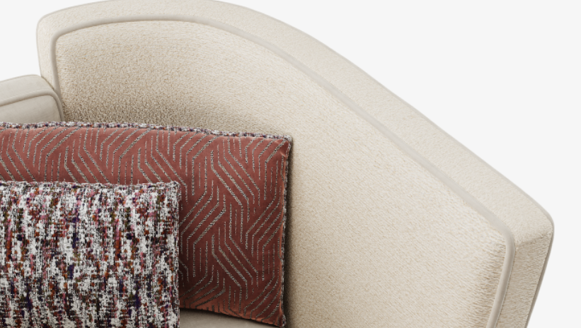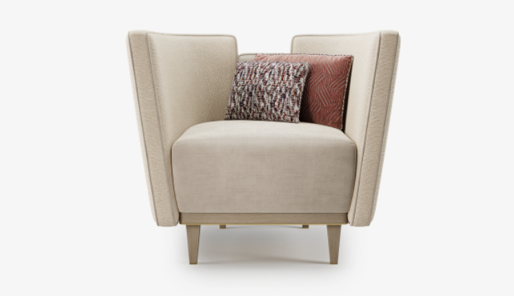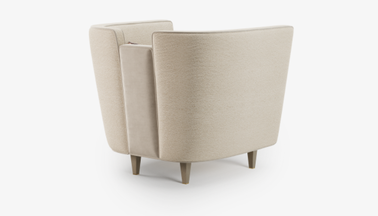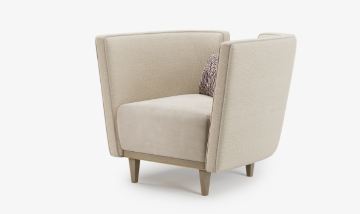 A sophisticated blend of plain and subtly patterned upholstery, the gorgeous GSTAAD armchair's distinctive silhouette is gracefully outlined with contrast piping, while a lacquered base and brushed-brass details enhance its elegant aura. Position solo or as a pair for double the impact.