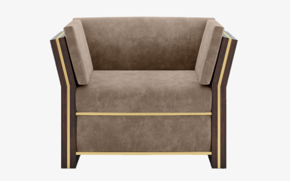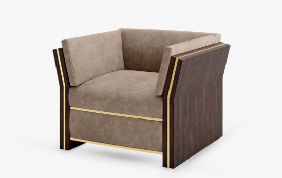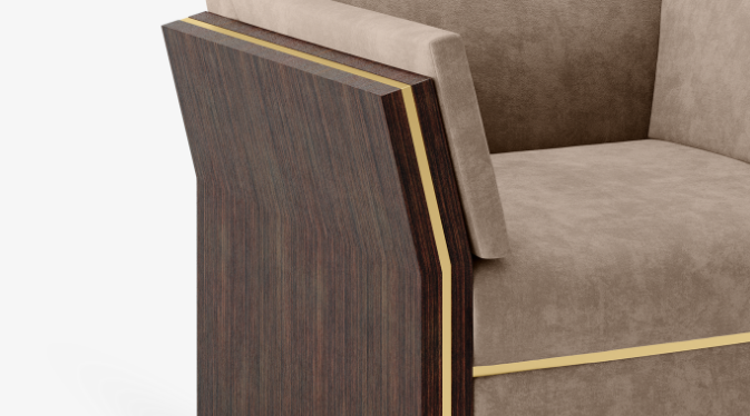 The UDAIPUR armchair uses materials in truly innovative ways. Its precisely angled arms are crafted from edifices of wood veneer with a thick metallic seam. These effortlessly suspend a smoothly upholstered seat, while side cushions offer further comfort and support.