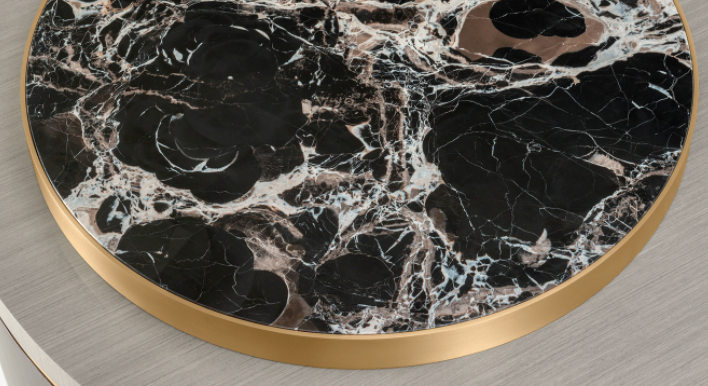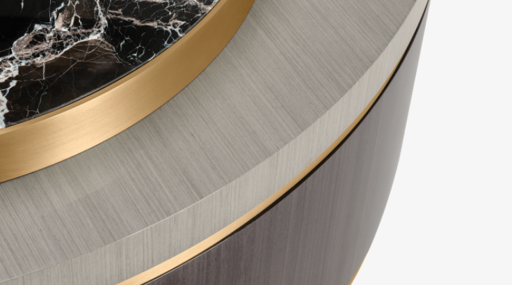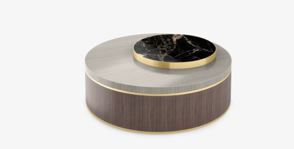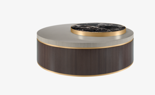 A symphony of circles and materials, the exquisite ATLANTA coffee table artfully layers metal and wood veneers. On the surface, a stone rotating tray with metallic trim is placed off-centre for a quirky and practical finishing touch.
