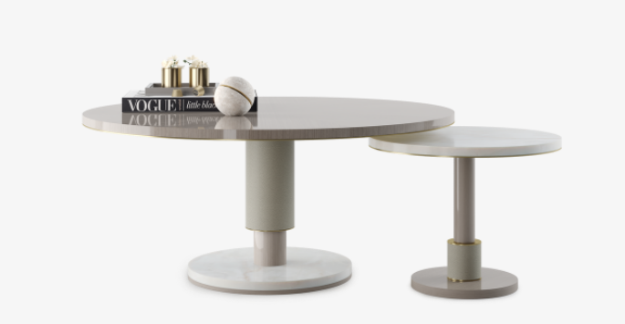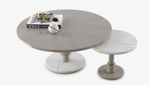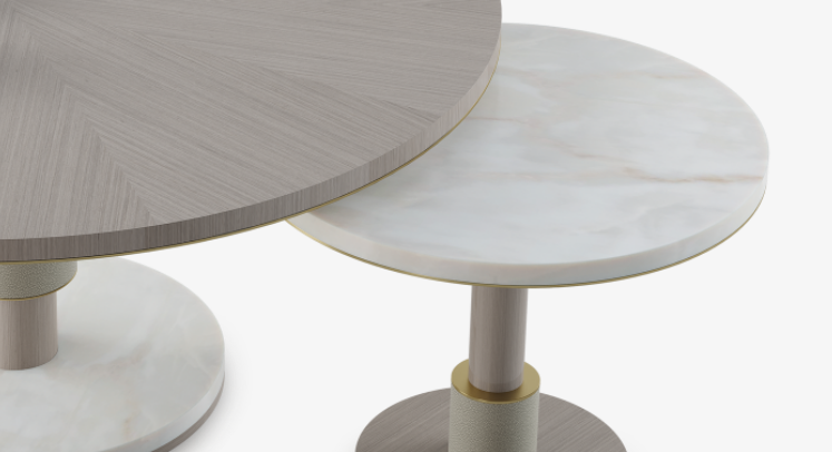 Crafted from a medley of wood veneer, stone, leather and brushed brass, the CADIZ Coffee Table is a simple way to add a medley of different textures and materials to your space. Made up of two distinct volumes that can separate or overlap, the design has built-in versatility.
