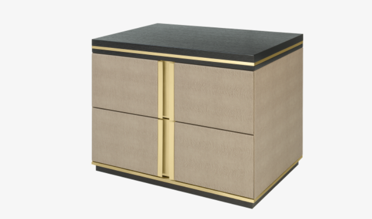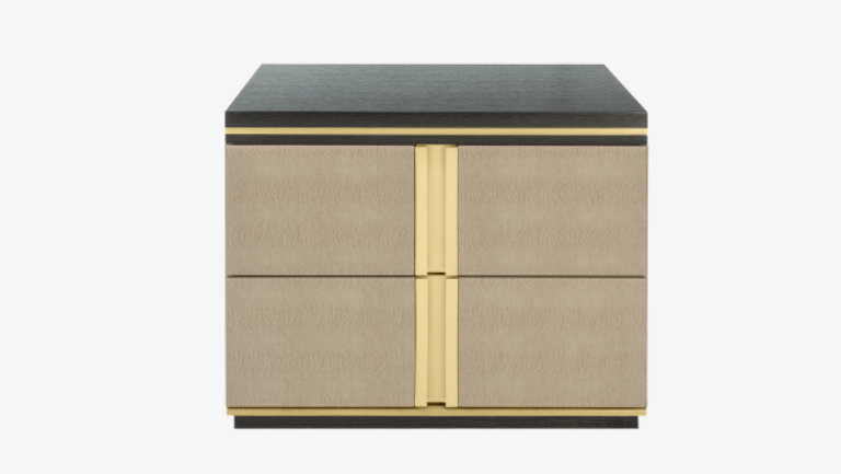 The cube-shaped AVIGNON Bedside Table incorporates two suede-lined drawers, both finished in leather and with inset handles crafted from brushed brass. To the top and bottom, sections of dark wood veneer accented with metallic concludes the design.