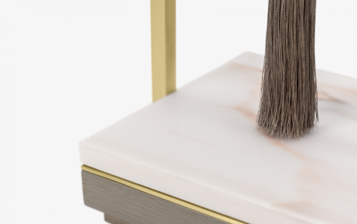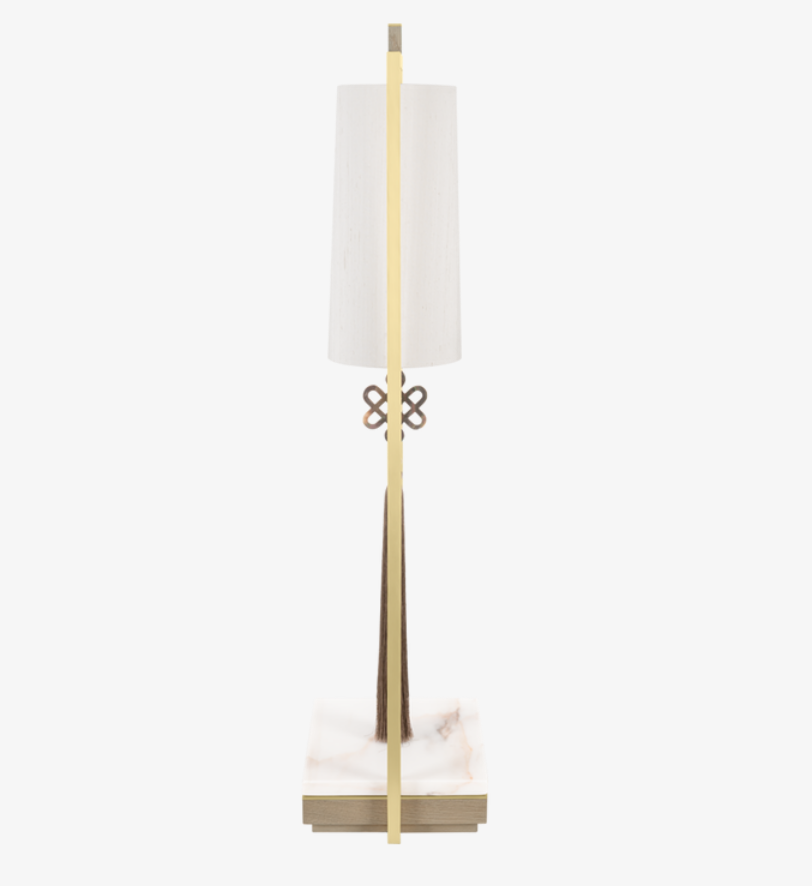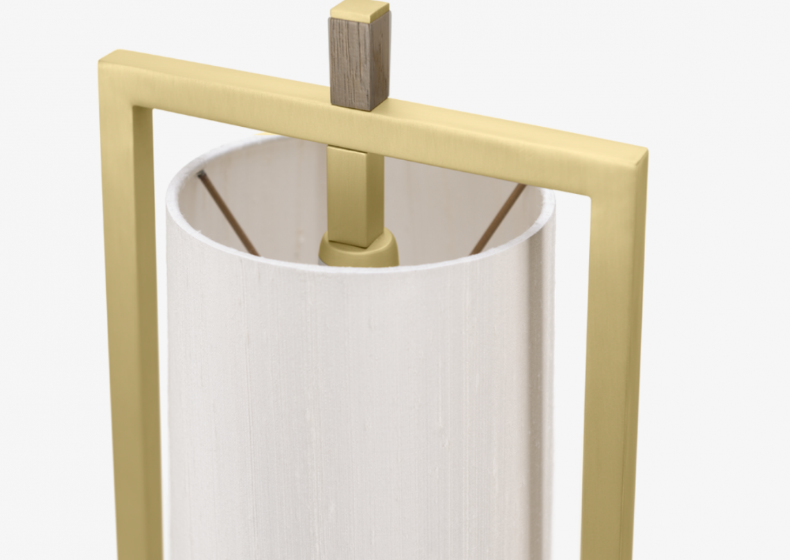 The globally inspired CHIANG MAI Table Lamp features a cylindrical shade woven from double silk and an ornamental tassel. These are suspended within an angular frame of brushed brass weighted by a base of stone and wood veneer.