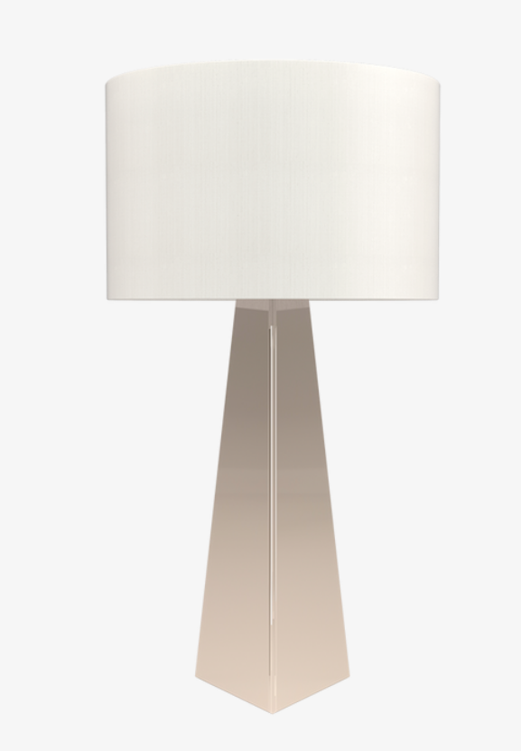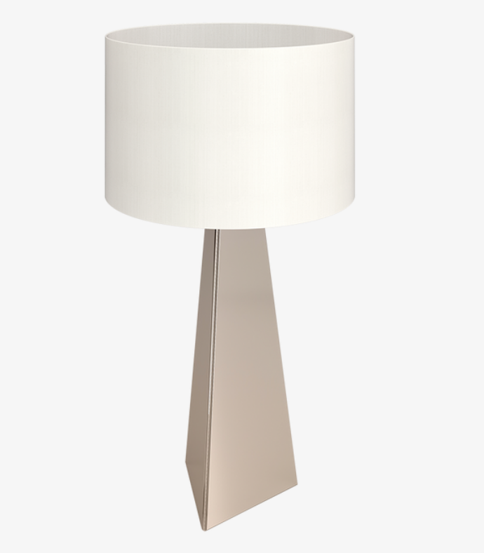 A fashion-forward table lamp, the OLIVA's flared structure is clad in bronze mirror, a material that gently reflects its surroundings and glistens when illuminated. Completing the design is a drum shade woven from double silk. Also available as a floor lamp.