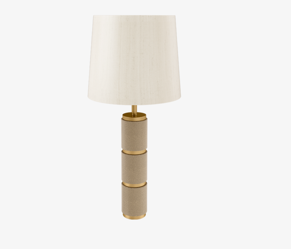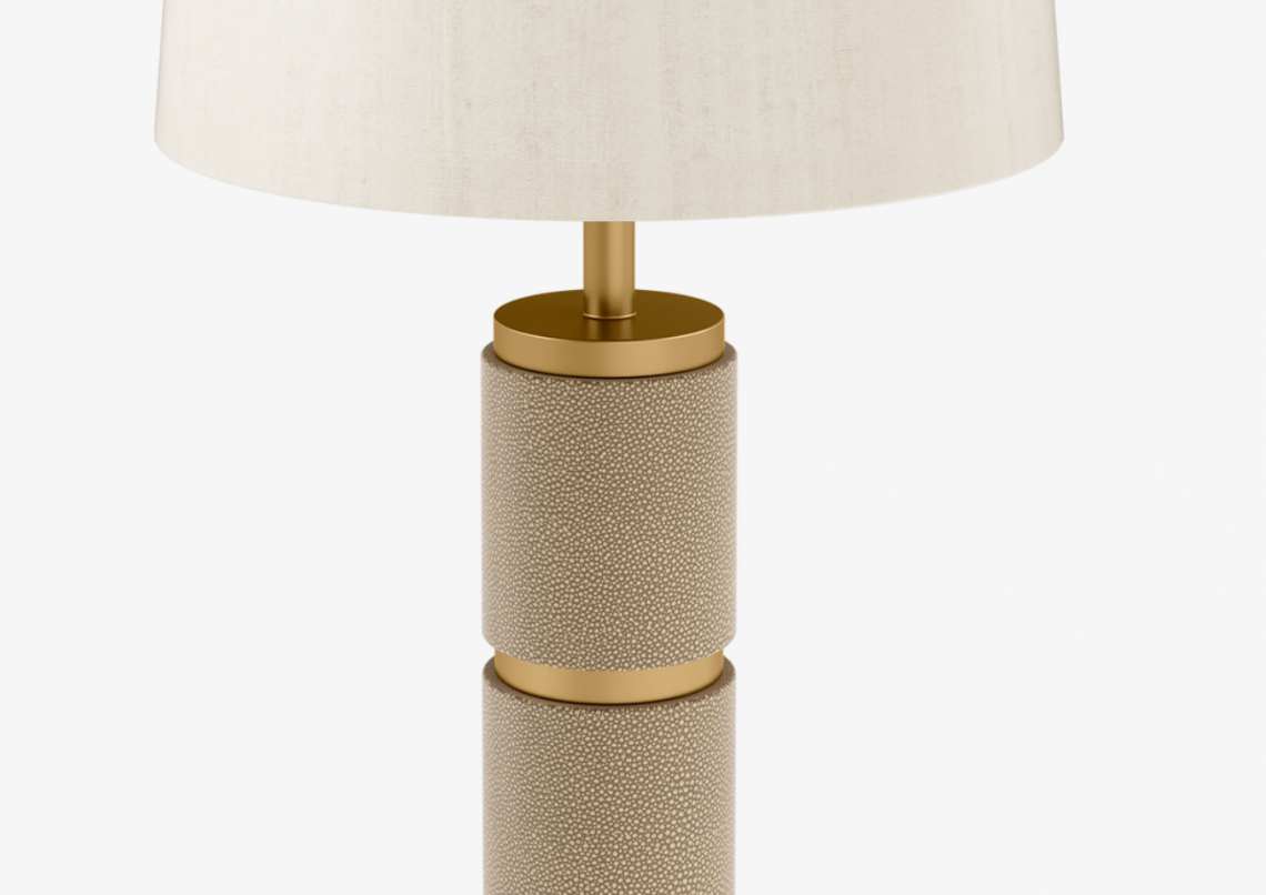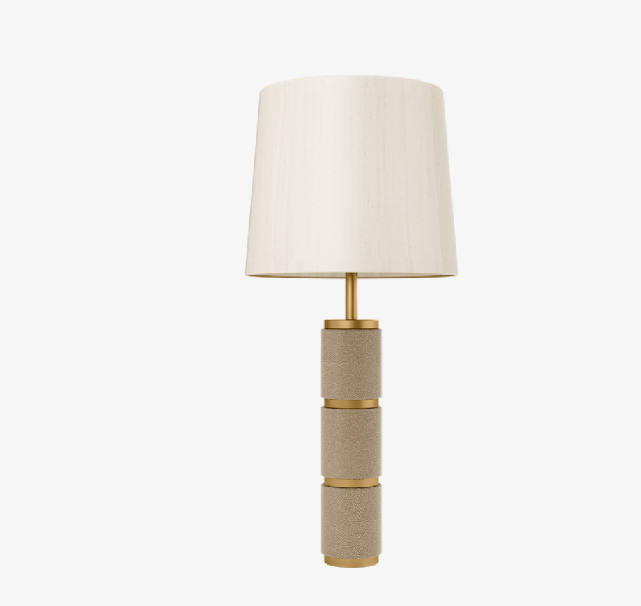 A chic way to illuminate your space, the elegant OMAN table lamp elevates its simple silhouette with a circular base that features alternating sections of structured leather and brushed brass. This is effortlessly balanced with a classic double-silk shade.