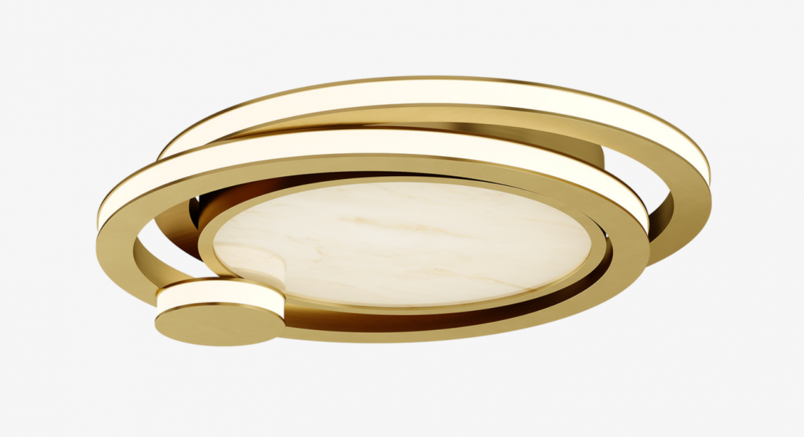 :Sitting flush to the ceiling, the QUEBEC ceiling lamp is made up of delicate overlapping circles of light that appear to orbit around a luminescent stone centre.