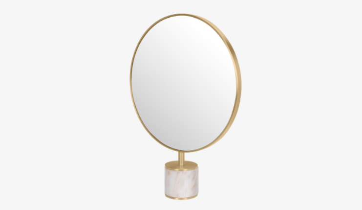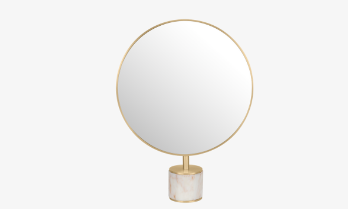 A beautiful piece to behold, the circular AGADIR Mirror is available in two different but equally practical sizes. Featuring a fuss-free silhouette, the design accentuates the looking glass while showcasing the splendour of two timeless materials: creamy stone and brushed brass.