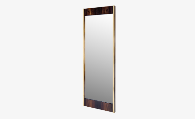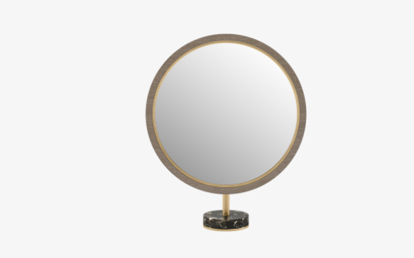 A classic looking glass design, the freestanding PARMA features a circular piece of mirror edged in brushed brass and wood veneer, an etched brass stem and a weighted base of stone layered over brushed brass.
