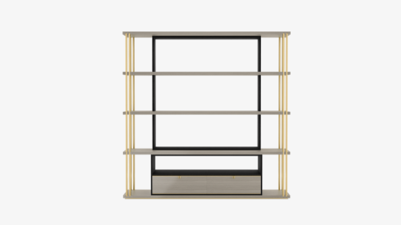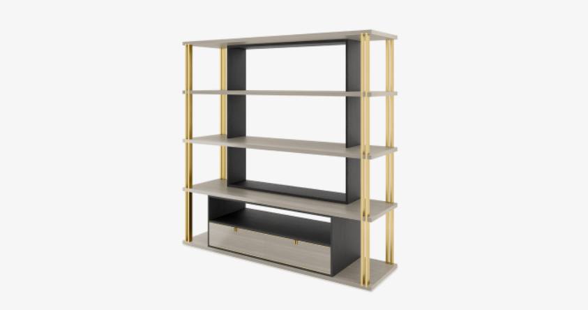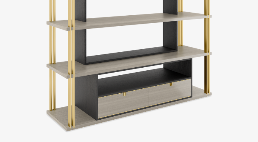 A blend of open shelves and low-level drawers, the stylish DHAKA design plays on the idea of a bookcase within a bookcase, inserting a dark silhouette at the centre of an outer structure crafted from contrasting wood veneer and luxurious brushed brass.