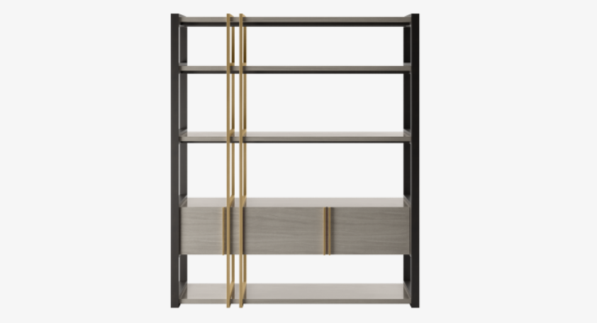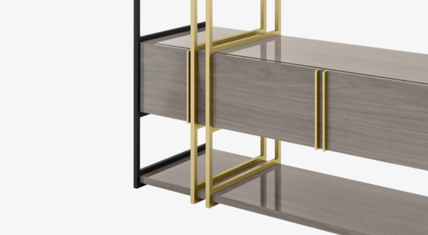 "Like a work of sculpture, the ODESSA possesses an abstract beauty. A blend of contrasting woods interrupted by a geometrical structure of brushed brass, it incorporates open shelves and a clandestine row of cupboards. "