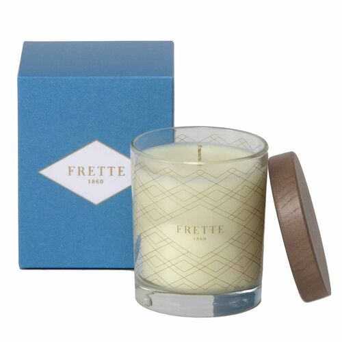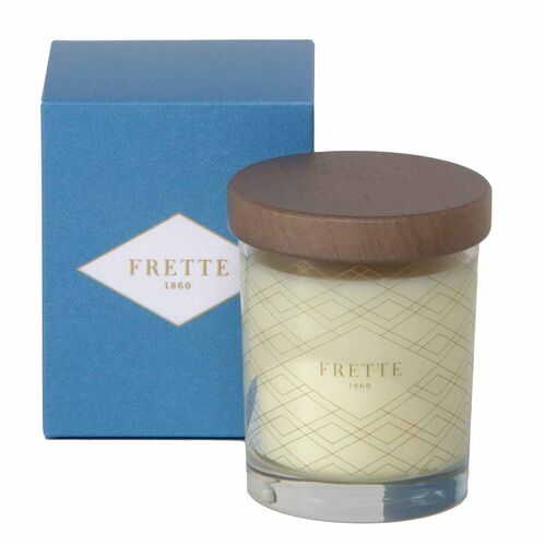 This refined candle holder contains a rose scented candle.Reusable holder is stamped with the Frette logo, and comes with a circular lid.Container: 100% Glass, Filling: 100% Wax. Made in Italy.