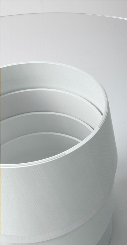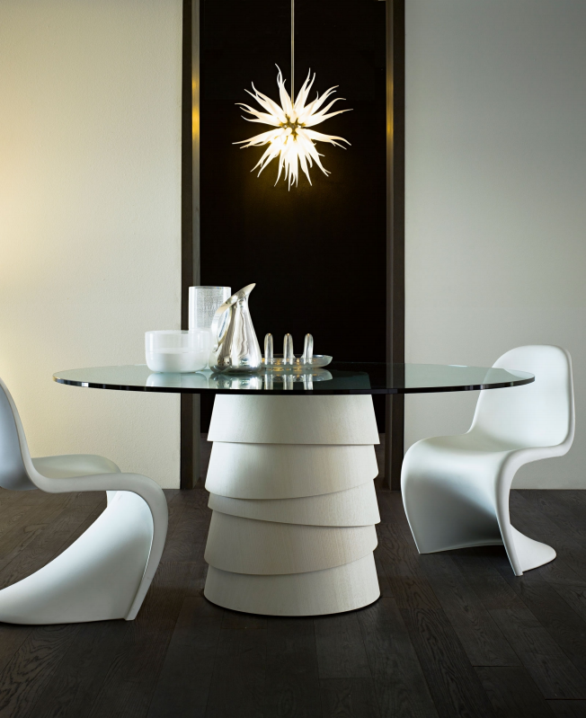 Table with 15 mm transparent glass top. Wooden base made of superimposed conical rings. Available in natural ash, wengé stained or white, black, saffron yellow, sand or chestnut open pore lacquer. The colour sequence for the base shall be indicated when placing the order.
