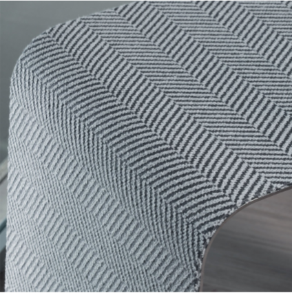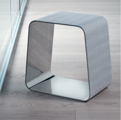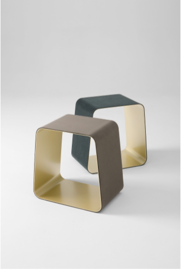 Bright stainless steel or embossed white, grey aluminium or satin brass colour lacquered metal stool, covered by felt, leather, suede, outdoor fabric (Corbezzolo) or velvet as per samples.