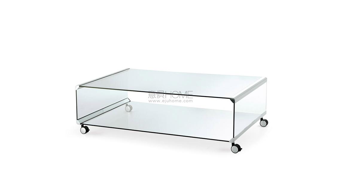 Coffee table in 8 mm transparent tempered glass. Bright stainless steel metal parts. Satin stainless steel, protected or embossed white or black lacquered brass metal parts on request. Available with or without castors (total height: 34cm).