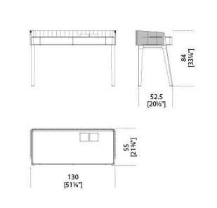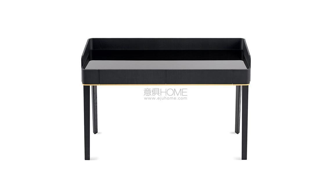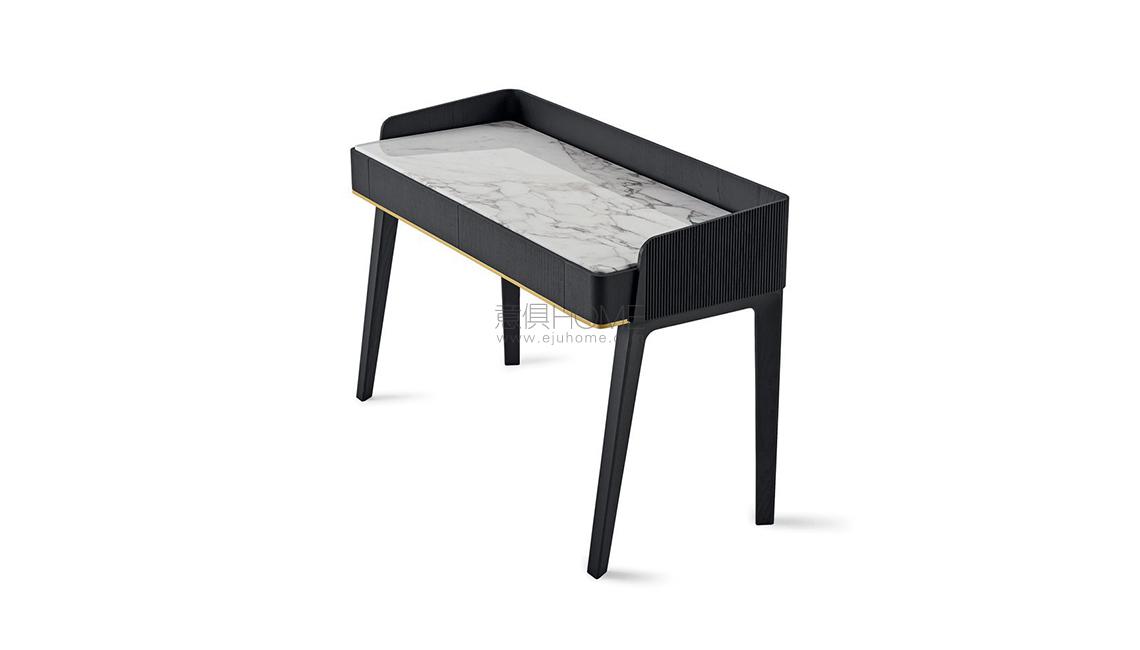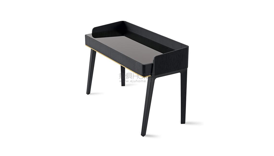 Writing desk in black (mod. Layer) open pore lacquered solid ash with hand-knurled border part. Calacatta Vagli Oro marble or liquorice painted glass top, in the bright or satin version. Supplied with two drawers with suede Grey 020 bottom. Bright brass metal parts.