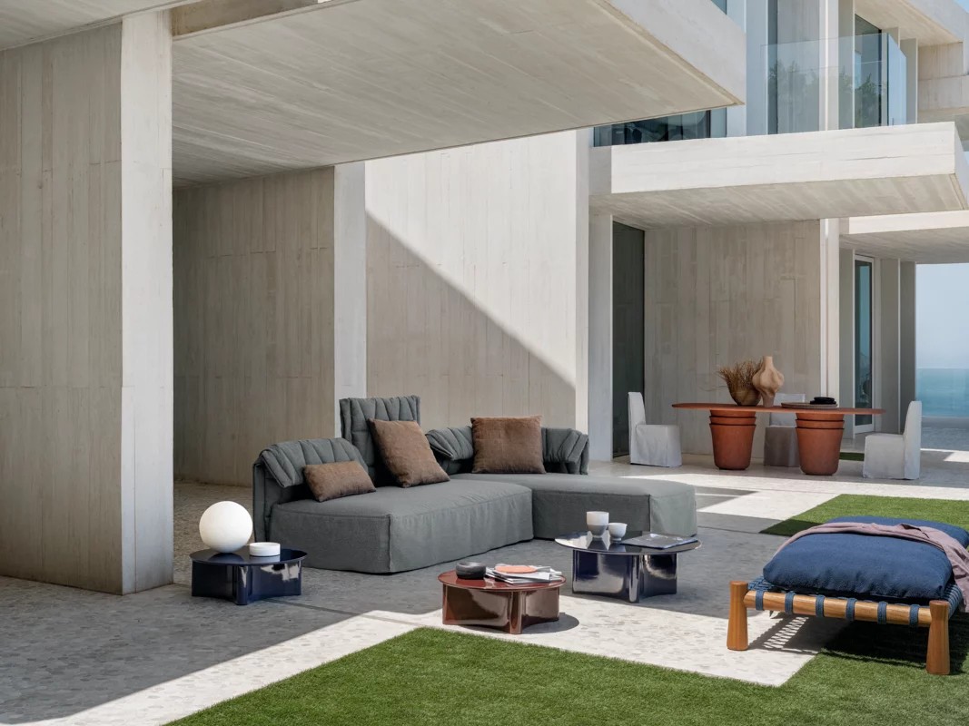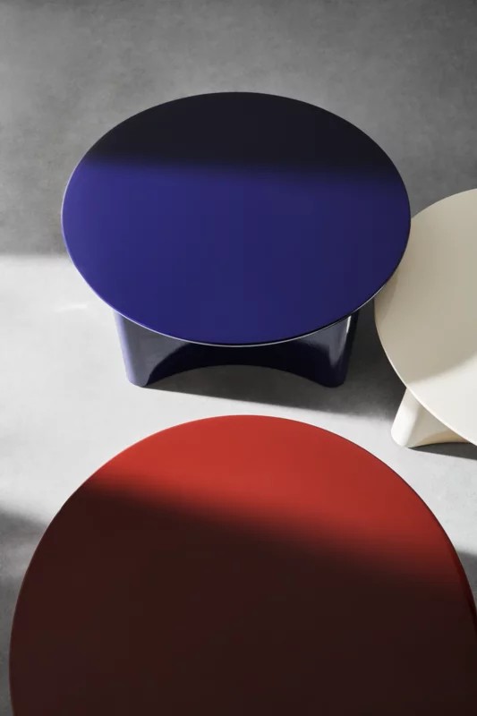 Tavolini bassi, con top tondo con base scultorea in Millgres nei colori Rosso, Bianco e blue.