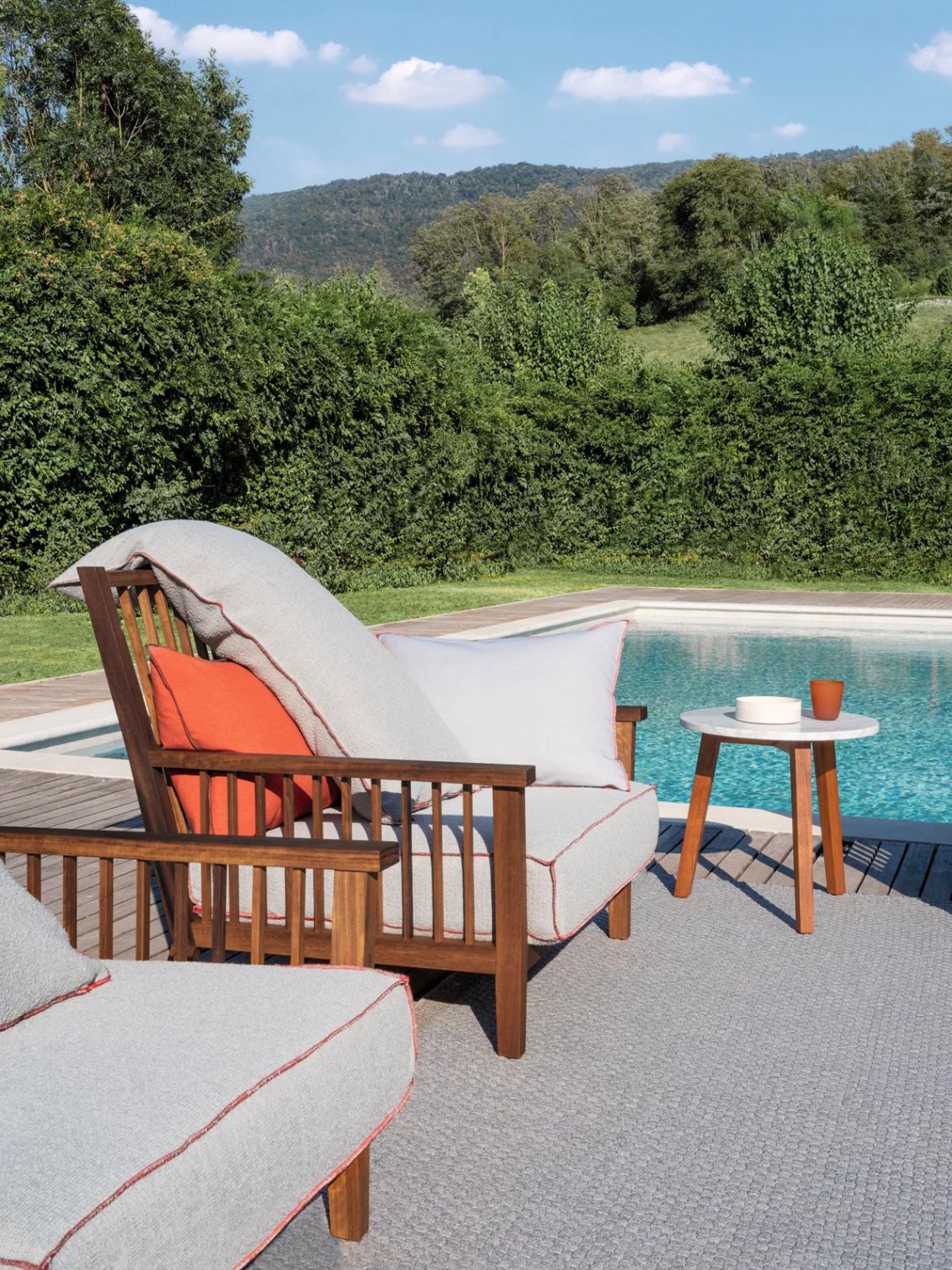 Famiglia di tavolini dallo stile classico, Inout 742/744 sono dei tavolini a tre gambe con piano rotondo: le gambe sono realizzate in Iroko oliato, legno particolarmente duraturo perchè naturalmente resistente all’acqua e all’umidità, che si unisce al marmo bianco Carrara del top.