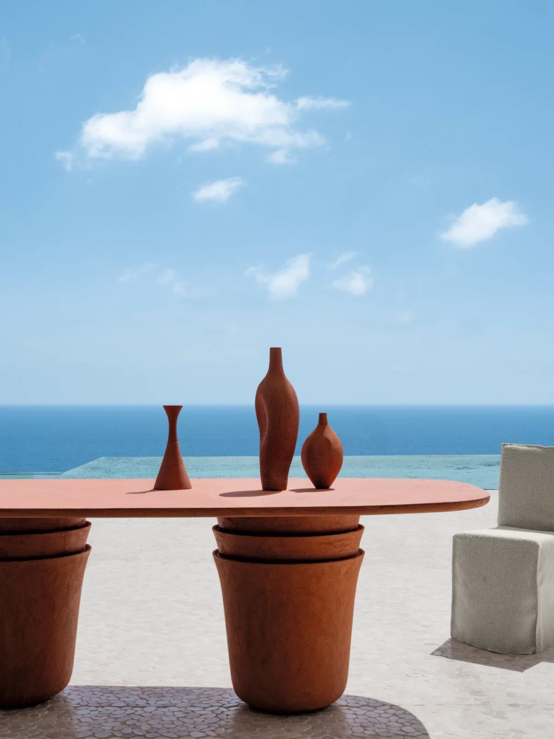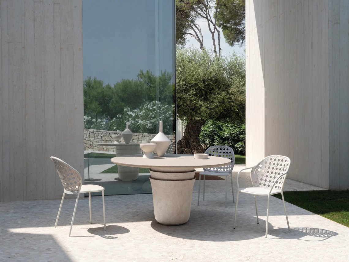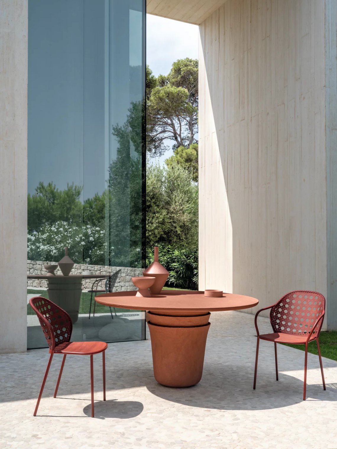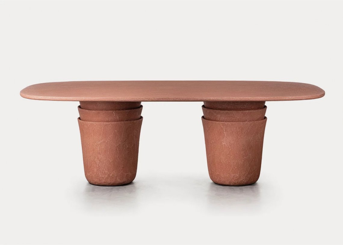 La basi dei tavoli sono realizzate in polimero espanso, mentre i piani sono in MDF., rivestiti con un sottile strato di argilla nei colori Terracotta o Sabbia. Grazie alla texture finale gli articoli esprimono matericità e una piacevole sensazione tattile.