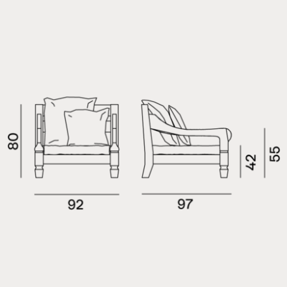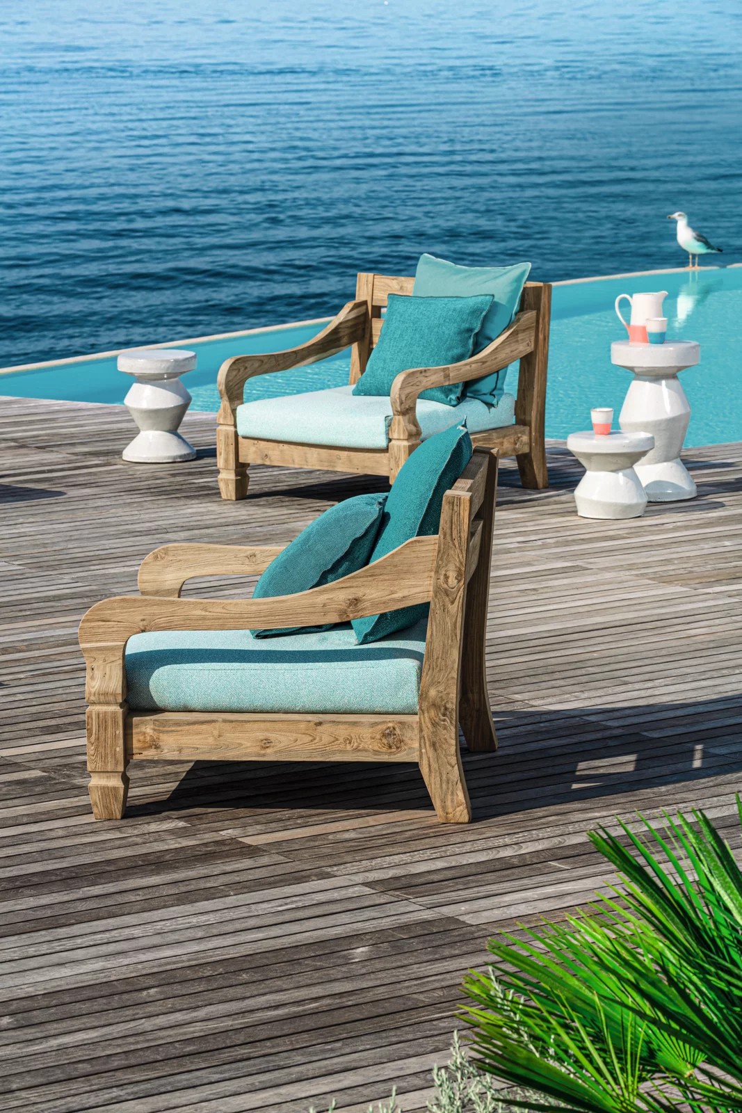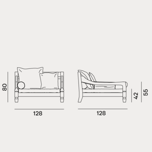 Poltrone in stile coloniale di ispirazione esotica, Jeko 01/05 hanno una struttura realizzata in ECOTeak, materiale proveniente dal riutilizzo di travi ed elementi in teak recuperati, riparati con legno riciclato, assemblati e levigati per evidenziare le venature originali. Sono caratterizzate da una seduta ampia e bassa, con cuscino sfoderabile a cui si possono aggiungere cuscini volanti per aumentarne il comfort.