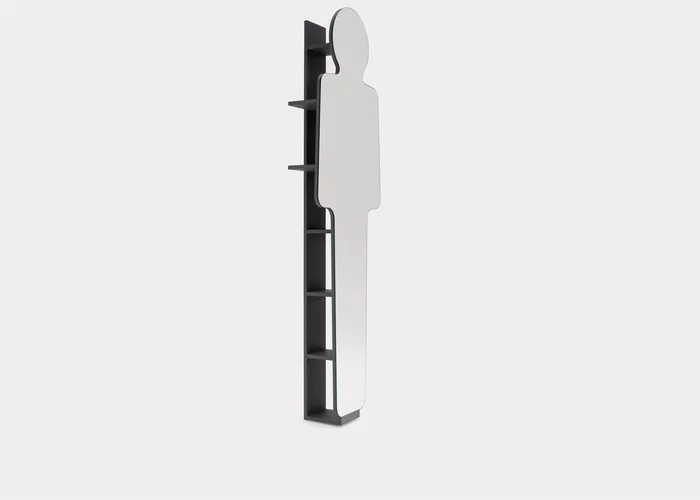 Specchio e mobile, LC 97 unisce due funzionalità diverse in un solo prodotto. Un progetto dal carattere forte in cui uno specchio a terra, che rappresenta una sagoma umana, integra e al tempo stessa cela un sistema a ripiani in noce canaletto naturale, nero, bianco o grigio, oceano o tortora. Disponibile anche senza sistema di ripiani (LC 197).