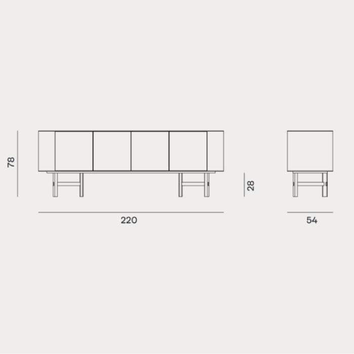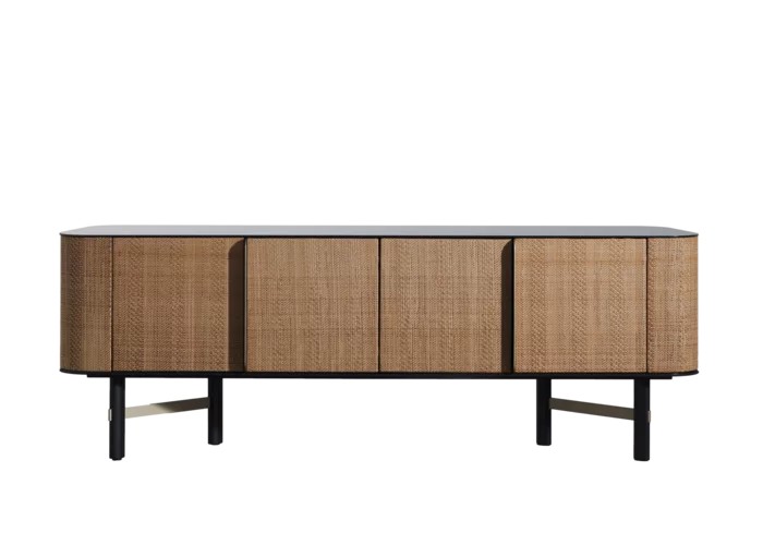 Madia con scocca in multistrato e MDF laccato. Quattro ante rivestite con tessuto in ecopelle idrorepellente e lavabile. Uno o due ripiani interni regolabili. Il top è disponibile in due versioni: gres porcellanato da 6 mm o vetro 6 mm verniciato. Base composta da gambe a sezione ellittica realizzate in legno massello laccate e collegate da barre in acciaio.