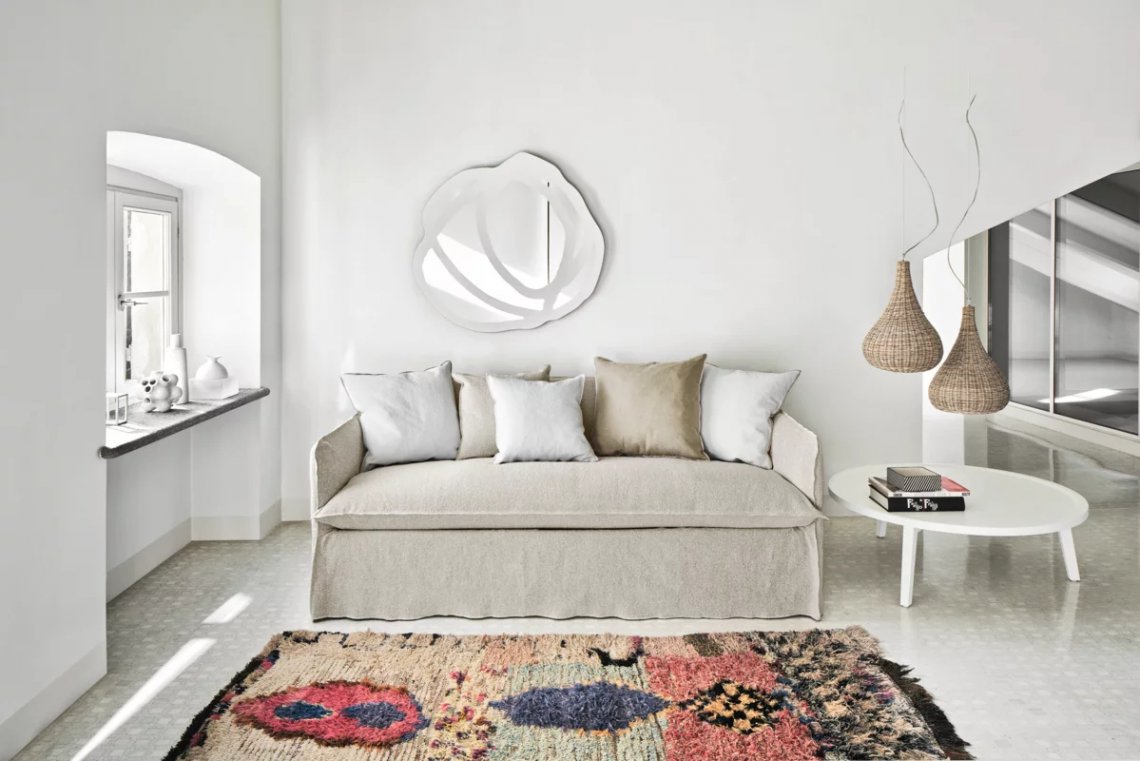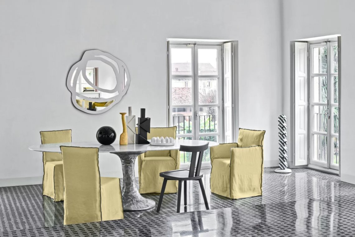 Famiglia di specchi a parete disponibili in due dimensioni, Sweet 97/98 sono caratterizzati da confini arrotondati ed irregolari. Si tratta di specchi con grande forza espressiva e decorativa grazie al motivo serigrafato nero o bianco che disegna sulla superficie cerchi e forme irregolari che si intersecano tra di loro, in un gioco di sovrapposizioni di linee.