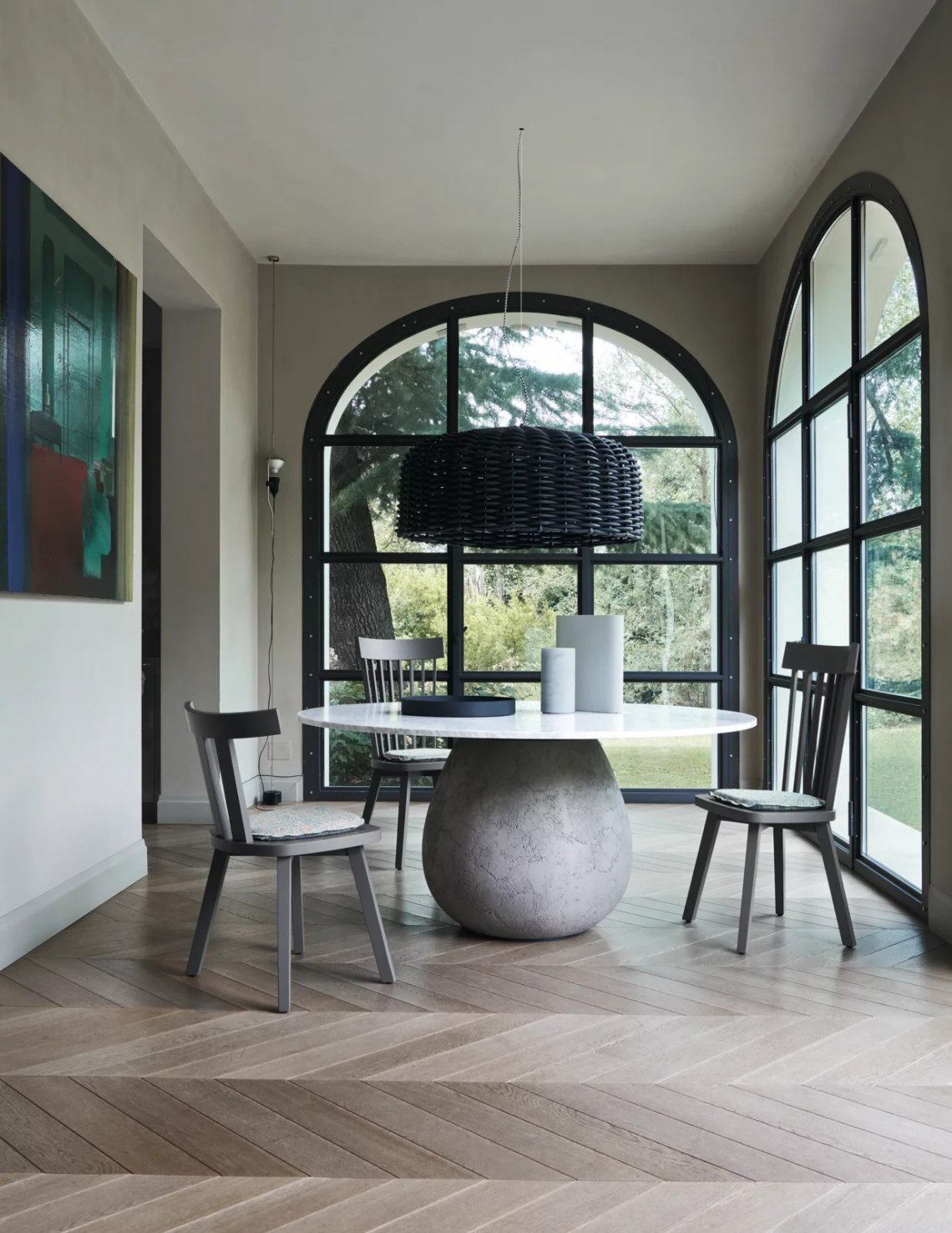 La sedia Gray 23 è definita da un particolare e minimale schienale: tre grandi listelli in legno, due verticali e uno superiore orizzontale, che abbracciano la seduta. La struttura è realizzata in noce Canaletto verniciato naturale, rovere sbiancato o rovere laccato bianco, grigio, nero, oceano o tortora, alla quale può essere aggiunto un cuscino di seduta opzionale per una maggiore morbidezza.