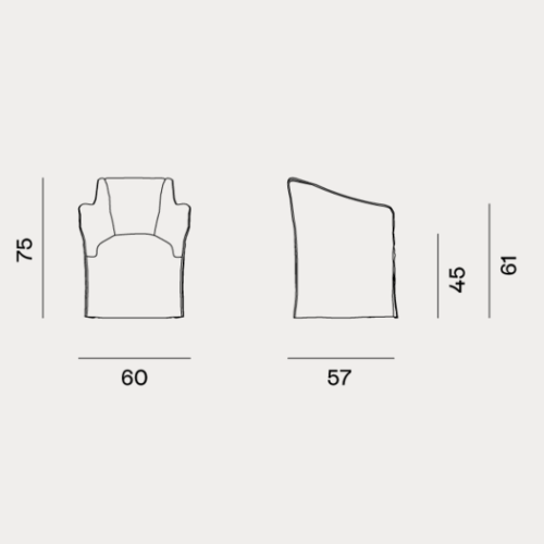 Poltroncina dining con imbottitura in poliuretano a densità differenziata. Rivestimento sfoderabile con piping. Disponibile in tutti i tessuti di campionario eccetto 3D, Quilt Malta, Nuage e Quilt Velour.