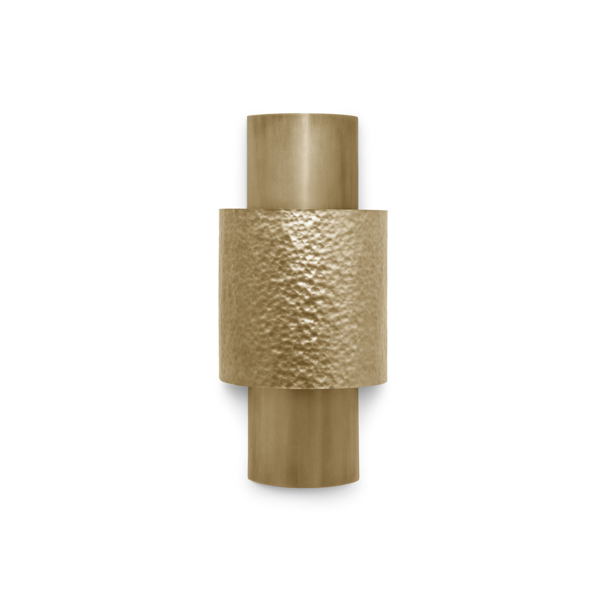 Projecting dramatic and warm light, the Bond Wall Lamp is an elegant and strong piece, with an exterior arc in polished hammered metal that enlaces the interior arc in brushed plain metal.