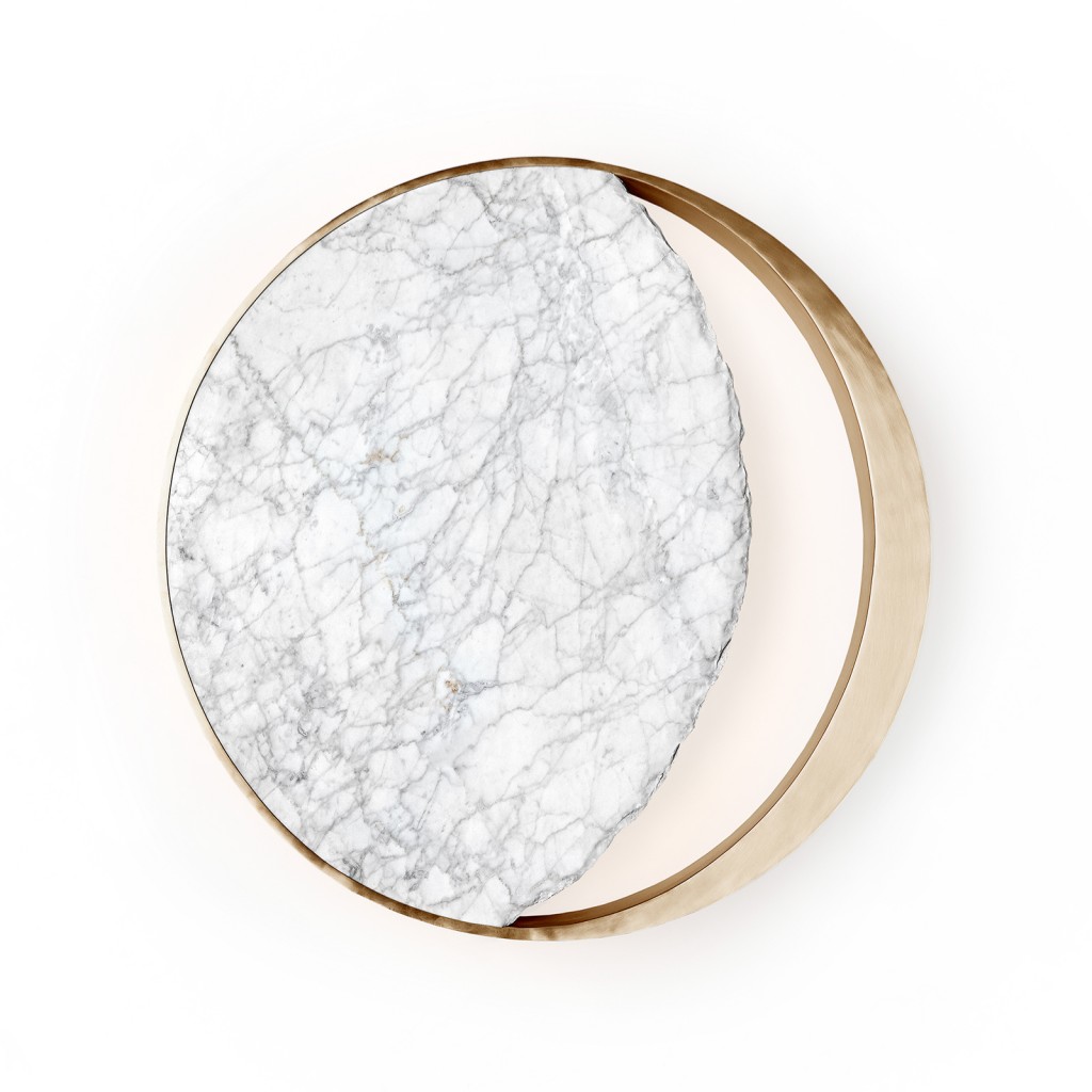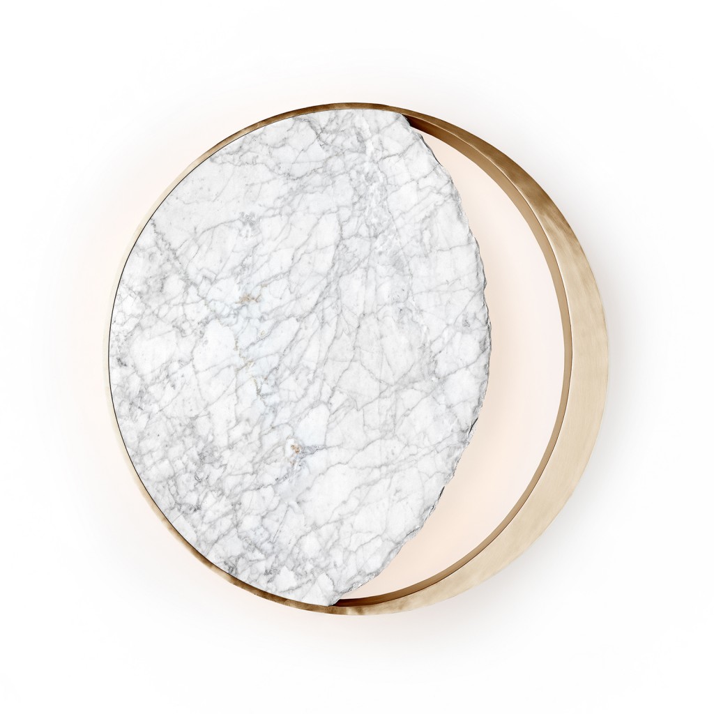 The Eclipse Ceiling Lamp provokes an intersection between light and shadow, stone and metal. When a third element comes into alignment, the subject, it’s demi-lunar light core and the metal rim that envelops the shape creates a stellar coronal light diffusion. The unique and sculptural hand-carved marble shade and hand-molded metal rim create a sense of invisible and harmonious movement.