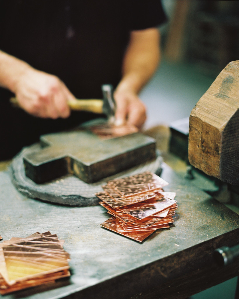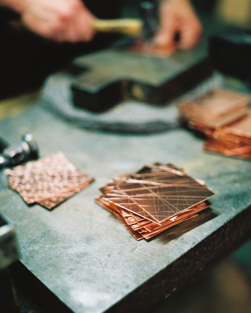 The unique veins of the marble are complemented by the soft backlight that comes from behind the hand hammered metal plate at the center of the Estremoz.