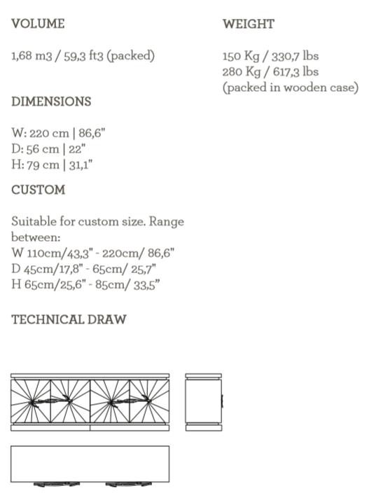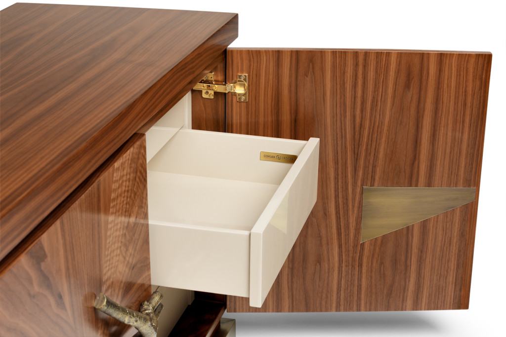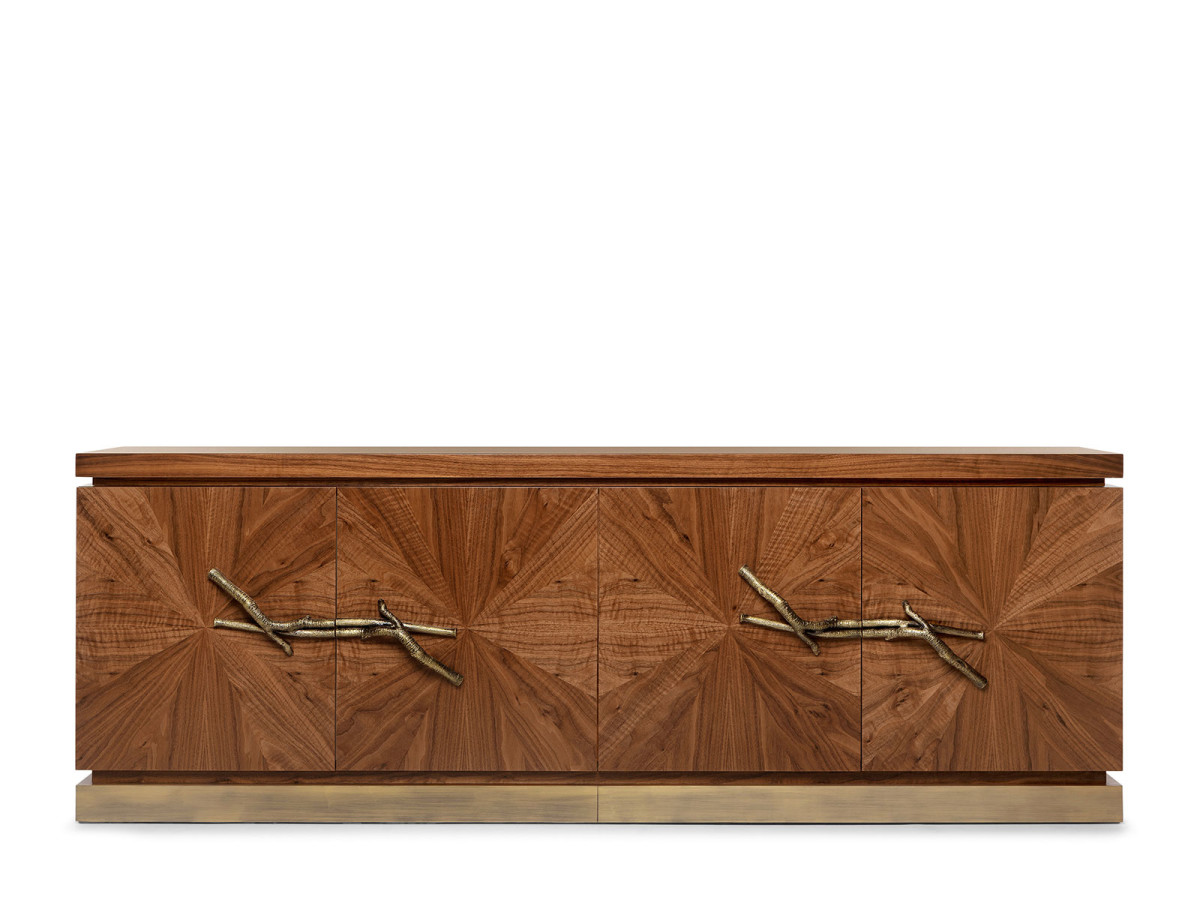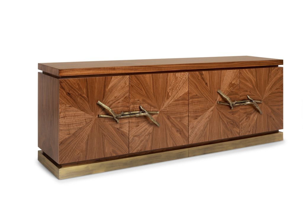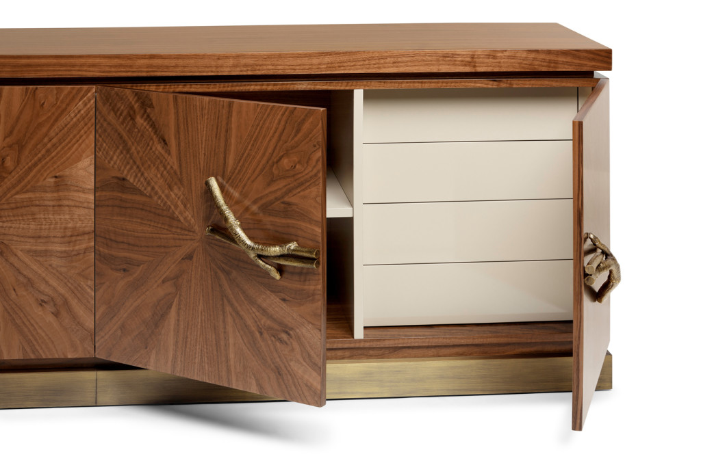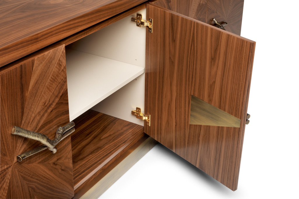 The woodwork of the Walnut, made with inlay marquetry technique, evokes the first rays of sunshine passing through naked tree branches. The unique door handles are made from tree branches in brass casting mold.