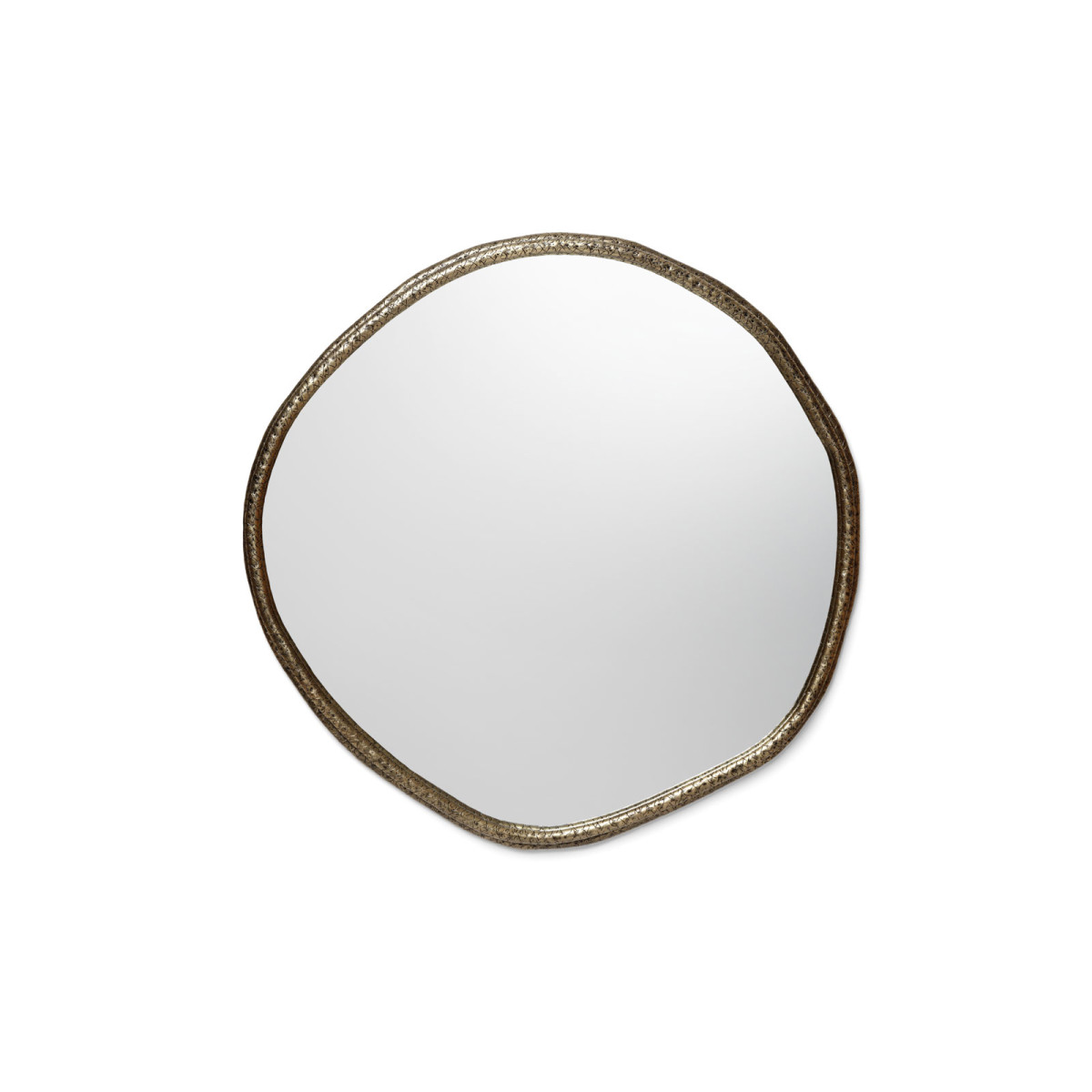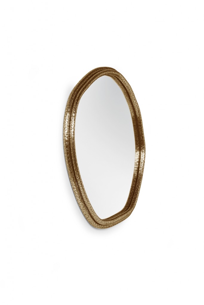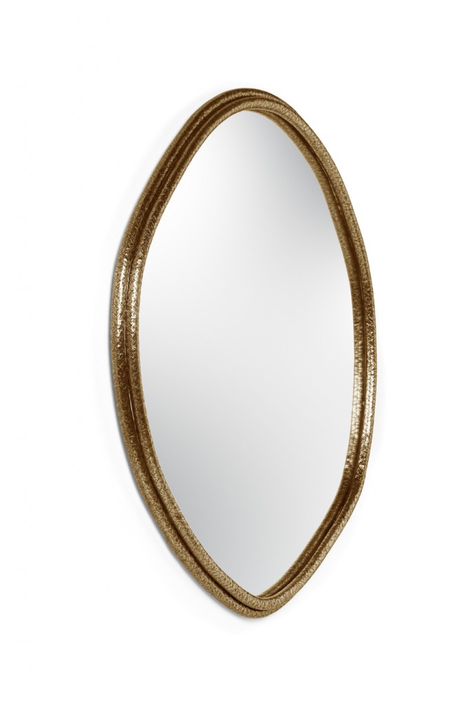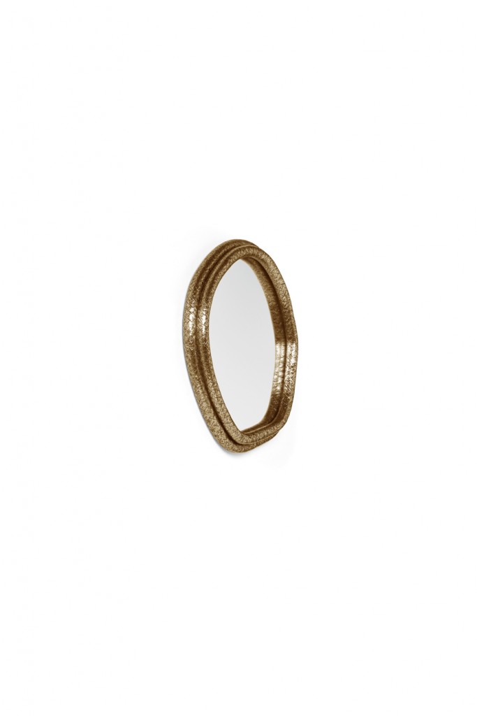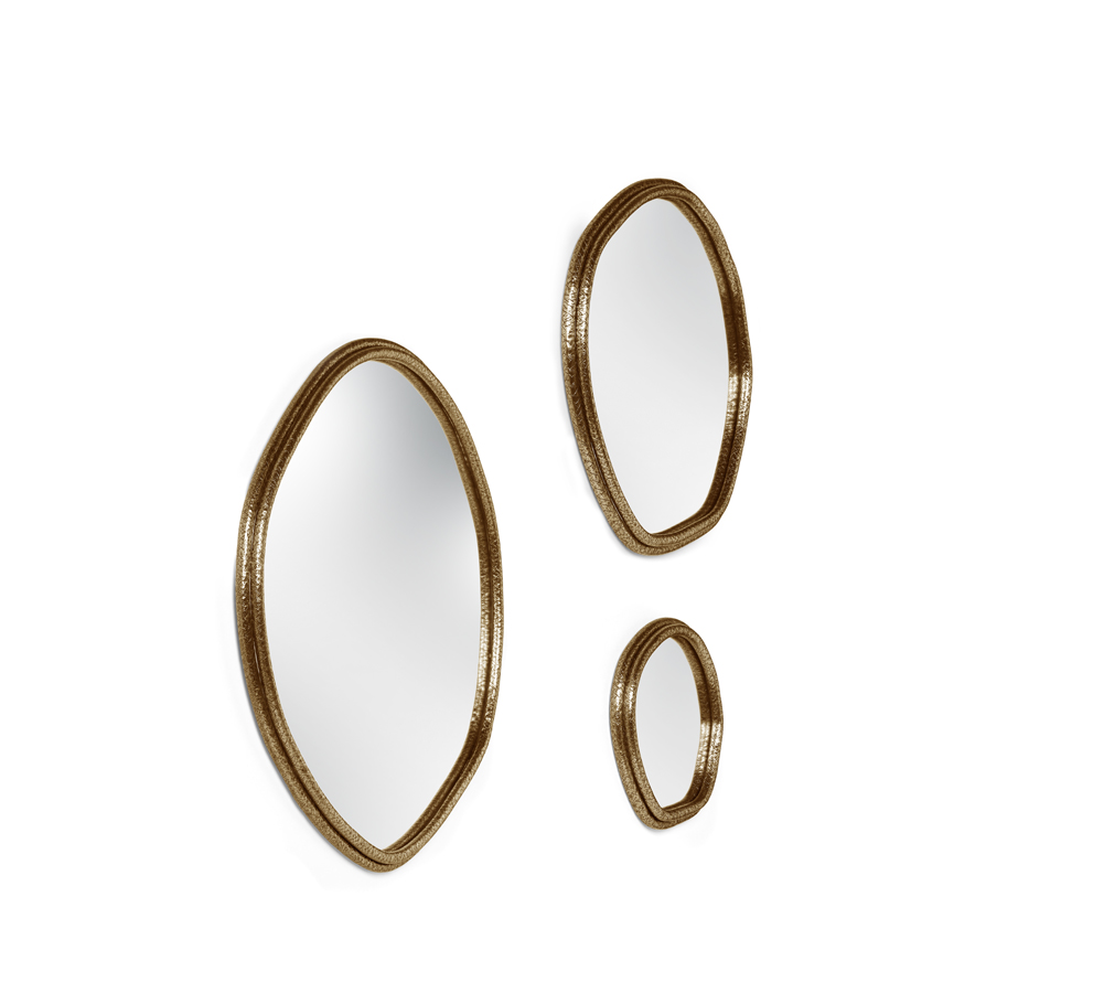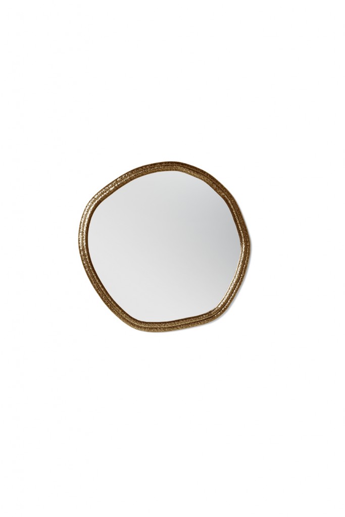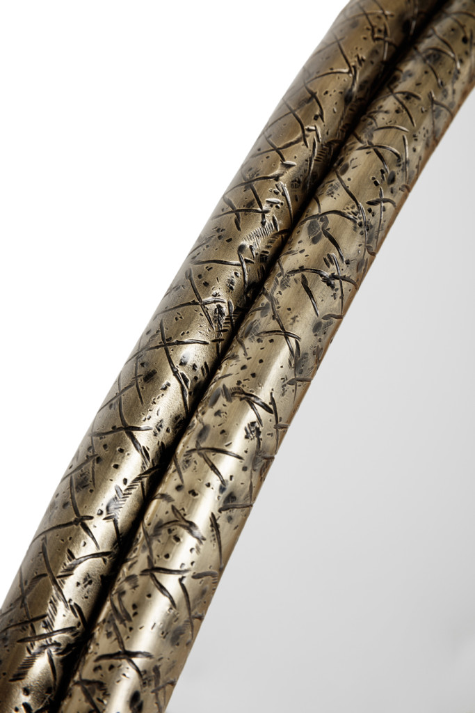 A tree’s core is a testament of the vital force of Nature, a realm where nothing is lost, all is merely transformed. The arches of this mirror are hand hammered in brass, shaped around a tree trunk. The mirror here represents time as a flat quasi-elliptical shape, therefore everlasting.