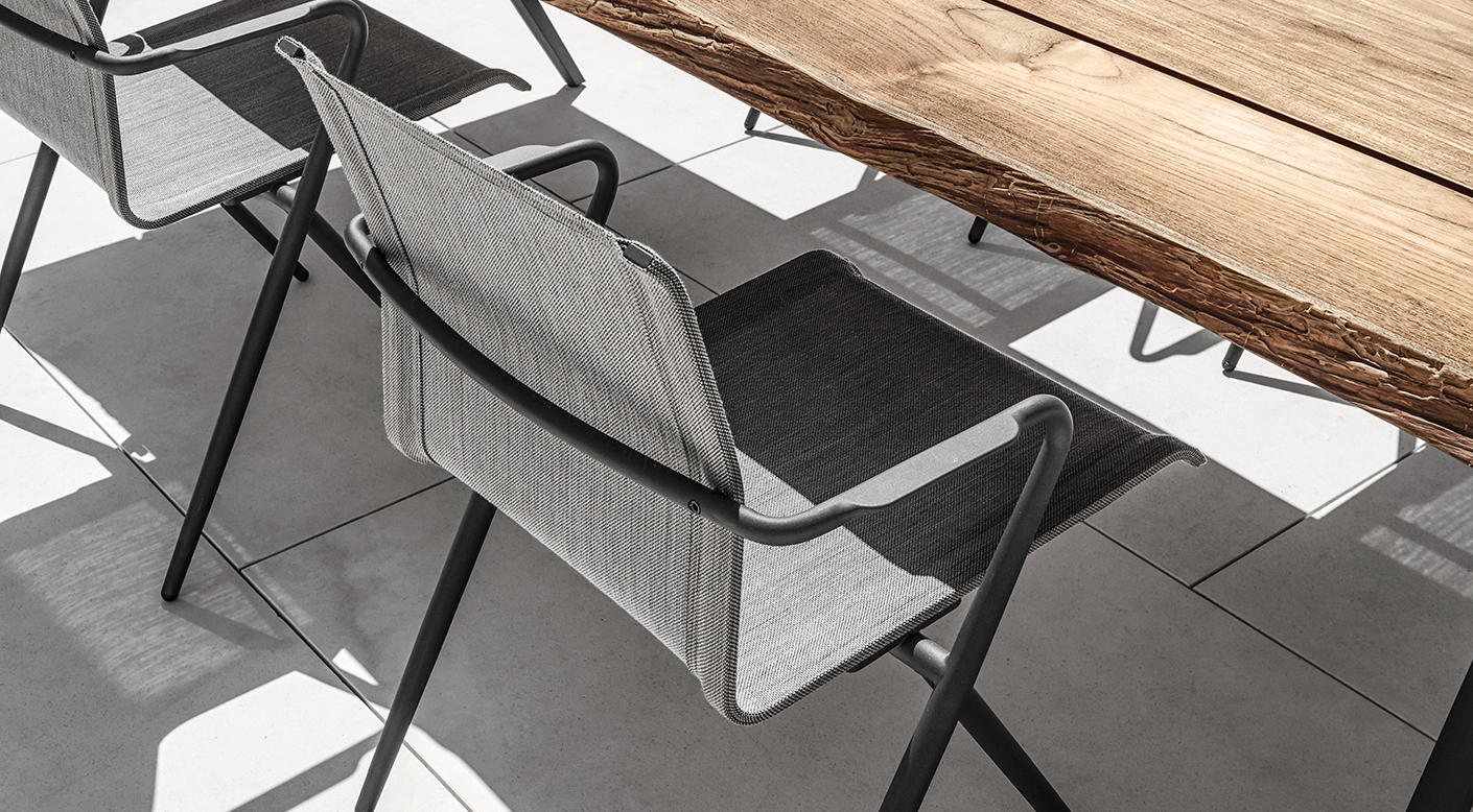 Perfectly poised, Ryder's slim, powder coated, stainless steel frame boasts a toughness belied by its fine lines. The converging lines of this stainless steel stacking frame are inspired by more traditional folding designs. But in a unique twist, removing the mechanism creates an unprecedented minimalism. Finely balanced on scissor like legs this architectural piece is purely aesthetics driven.