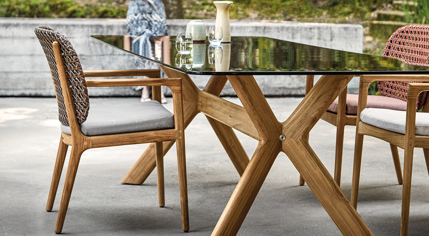 The humble table re-imagined. A place to meet, a place to eat, a place to share time, with no compromise on design. X-Frame combines a smoked, grey glass top that reveals the support below. Expertly crafted from plantation teak, this elegant yet supremely strong underframe quietly complimented by an understated top epitomises Gloster’s approach to design.