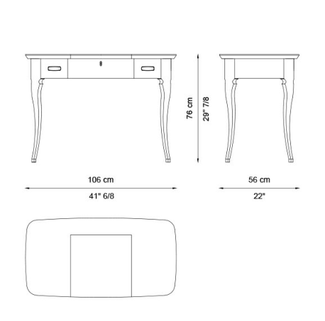 Vanity table with ash wood veneered top with shaped solid wood edge and pull-up mirror. Solid wood and ash wood veneered structure. Drawers runners with Blumotion technology. Brass Decò handles, with buffalo's horn inset.